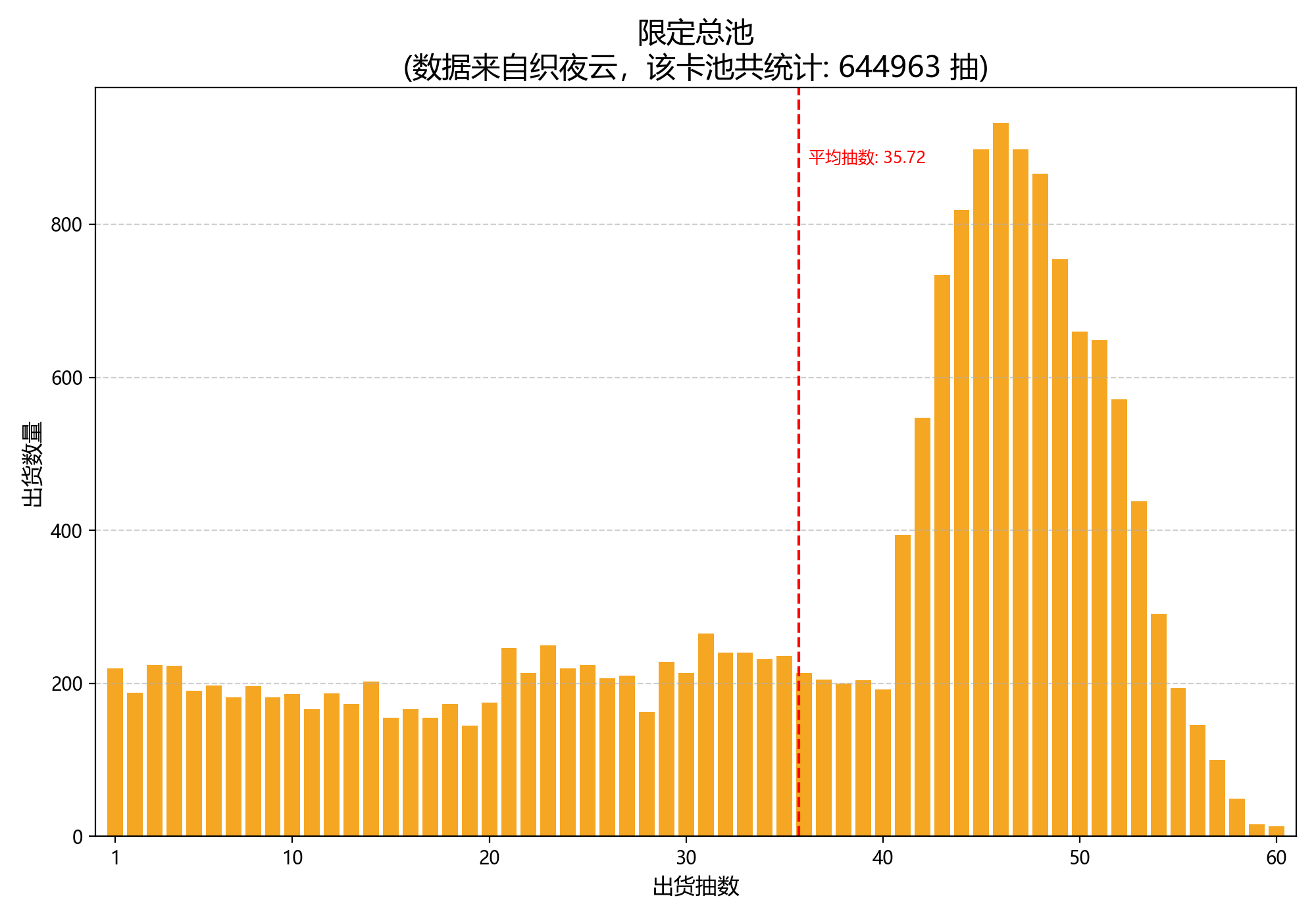 通过统计大家上传的644963抽限定池数据,可以算出第一抽就出红的概率是1.2%左右。计算得到的平均抽数是36.9,和之前论坛中homie的统计非常趋近。你以为到这里就结束了吗,其实并没有,将数据带入概率分布图我们就会发现,实际数据中限定池的出货在21和31抽都略微提升了,而且统计的平均抽数来到了惊人的35.8抽,这不符合我们估算的概率。