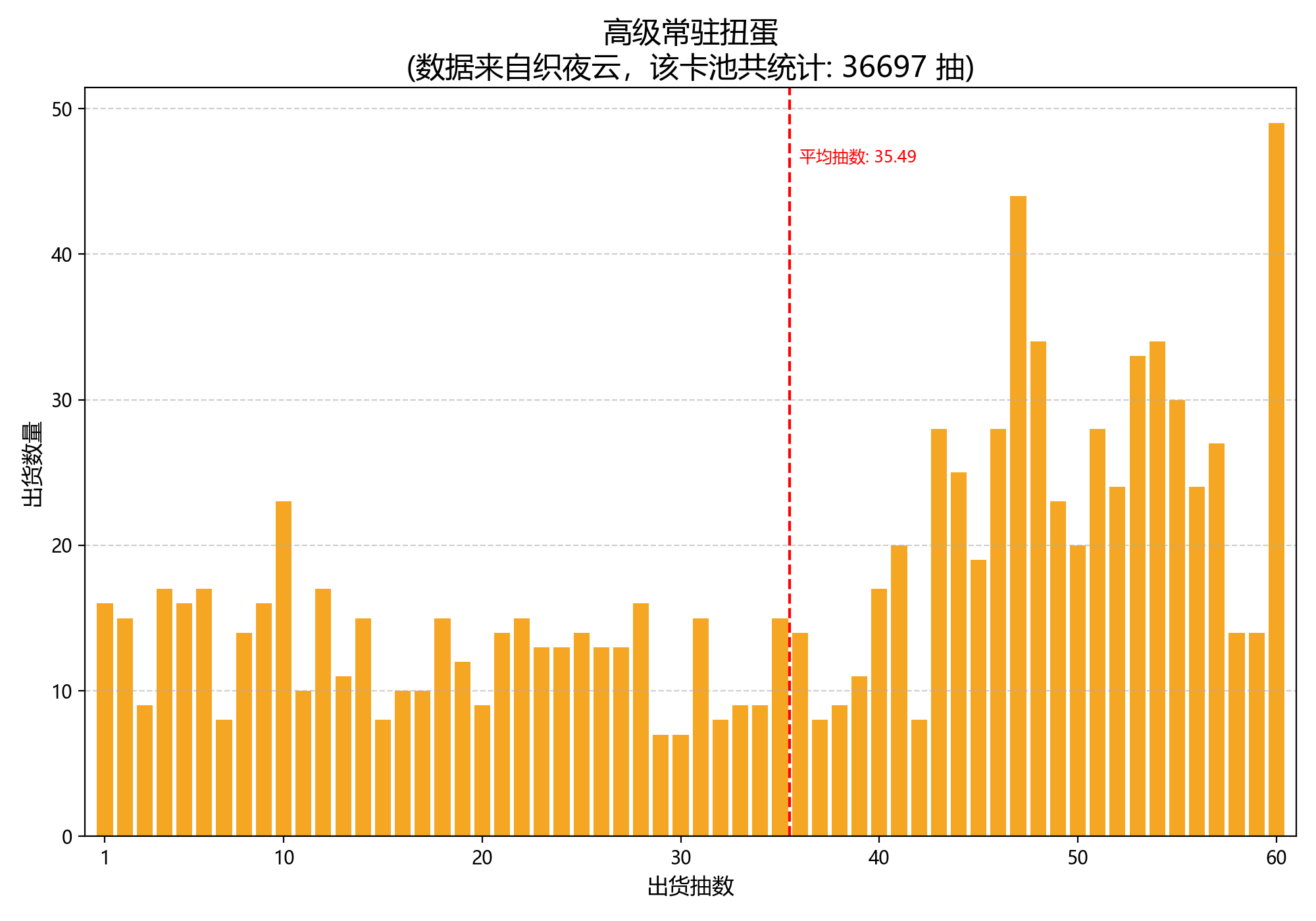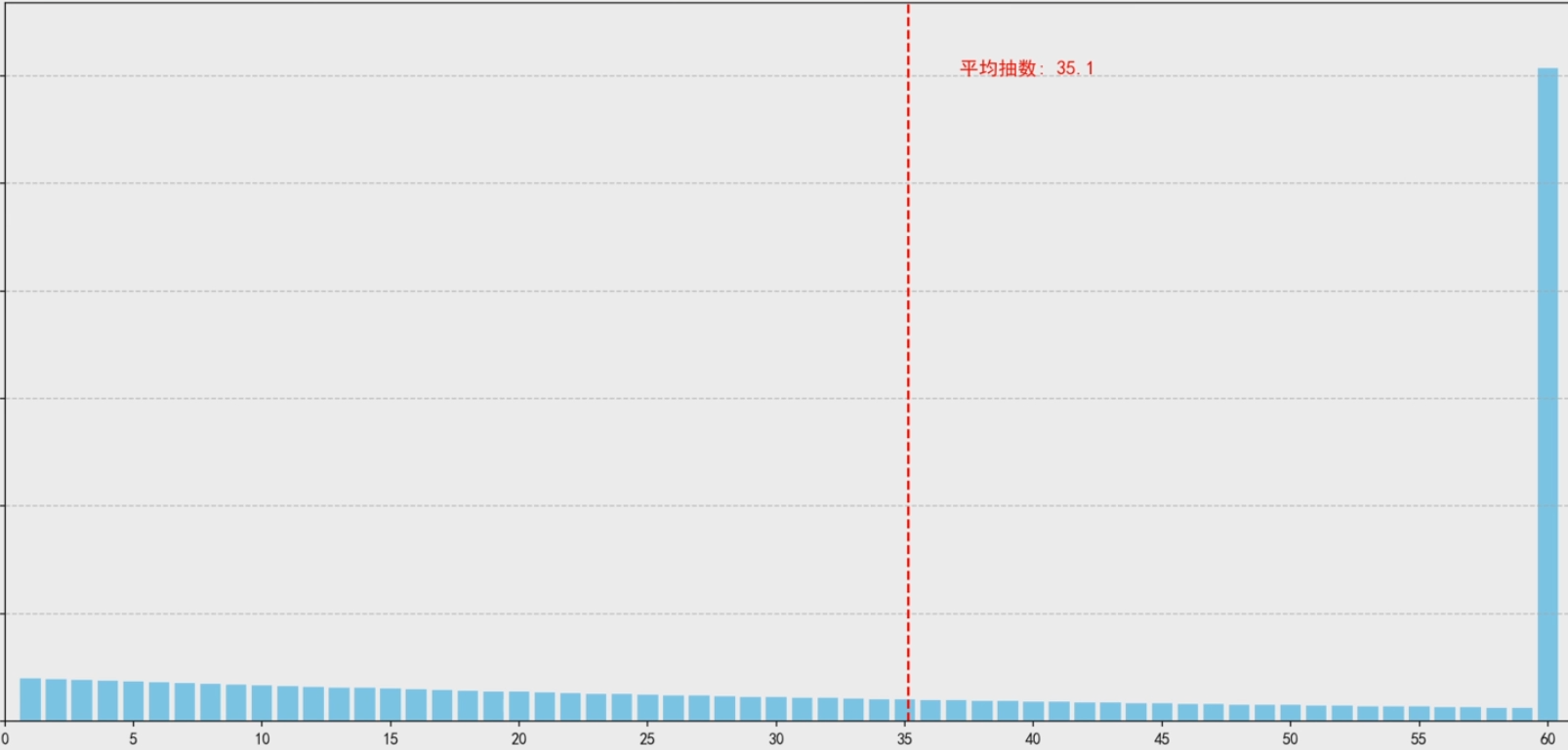 开个玩笑,我们盲盒派对可是良心游戏,不可能这么黑,而且要是没保底的话抽数分布可就长上面这样了。显而易见的是盲盒还有60抽硬保底机制,在假设每抽概率都是2%出红的情况下,抽数的分布长这样,平均期望为35.1抽