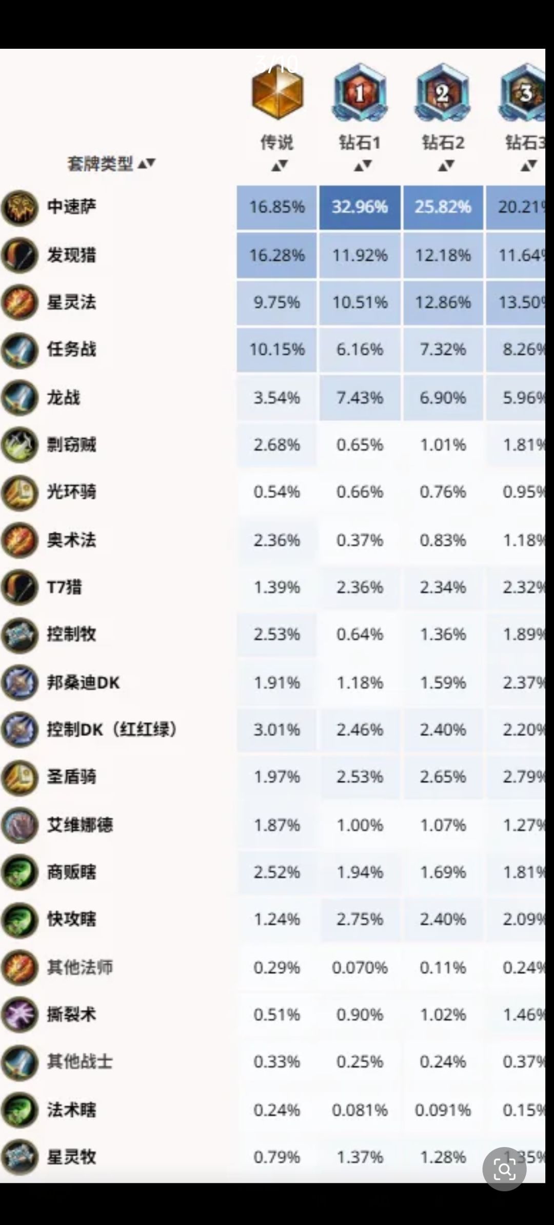 顶部发现猎和贼较多,其他分段萨满出场率胜率几近垄断,上传必须面对萨满。