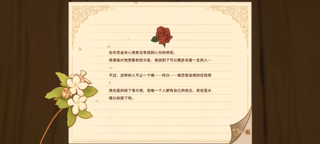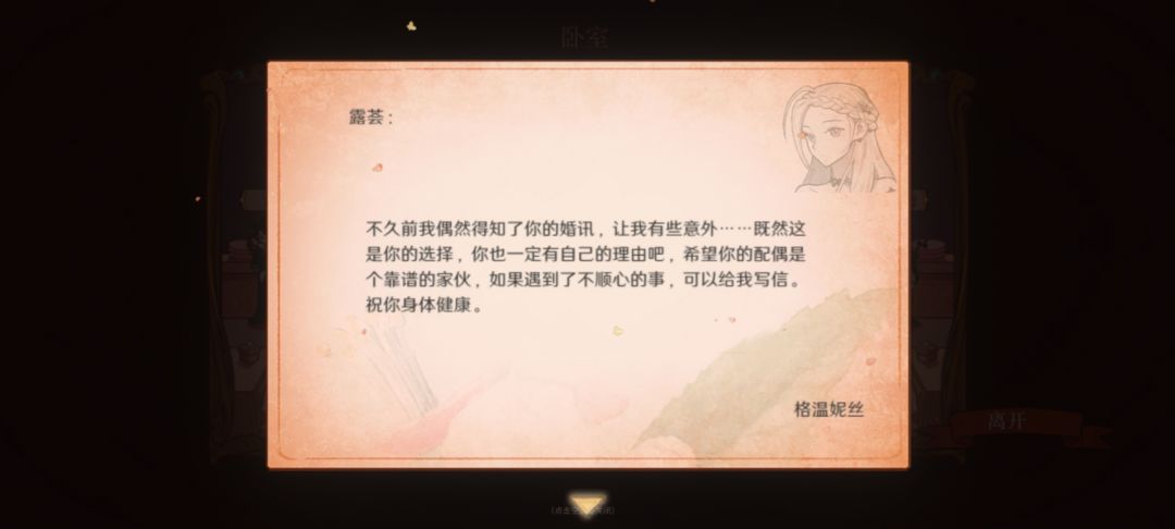 因为第二回玩时候是和泽的结局,收到了格温妮丝心碎的信(泽好感度第一结婚,格温妮丝好感度第二寄来特别的信)