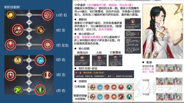 SP萨是富婆沙娜姿上线前的法系AOE一姐。身为守望者职业,超大范围的高爆发AOE法师。同时是作为AOE最强阵营侵略如火的阵营核心,具有火阵的阵营光环。SP萨最大的特征是具有A全图的能力。这也是铃兰开始强化阵营特色,阵营内角色会相互加持的第一次尝试。SP萨在场的时候,当自身具有光辉守望光环的时候,侵略如火和法皇阵营的队友,在攻击前都可以给敌人上审判烙印的标记。这个标记不仅让敌人受到伤害增加(可以和其他易伤效果叠加),当SP萨行动结束的时候,就会对标记了审判烙印的敌人,产生AOE的追击伤害。