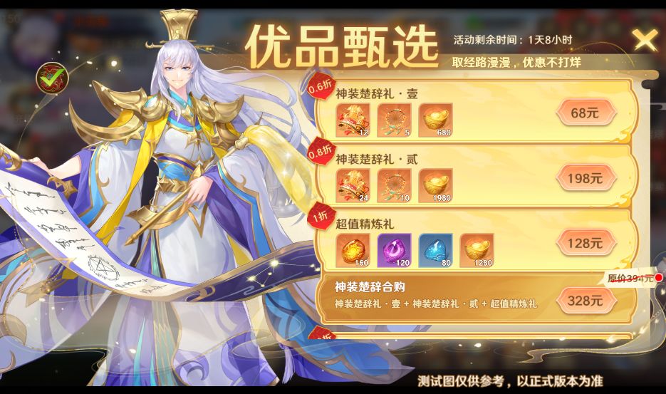 神装楚辞合购礼包中的神装楚辞可供1件九州神装觉醒为上古神装,同时包含大量精炼石。合购礼包包含神装楚辞、捕灵网、稀有精炼石、高级精炼石、中级精炼石以及大量元宝,单个礼包折扣最高可达0.6折!