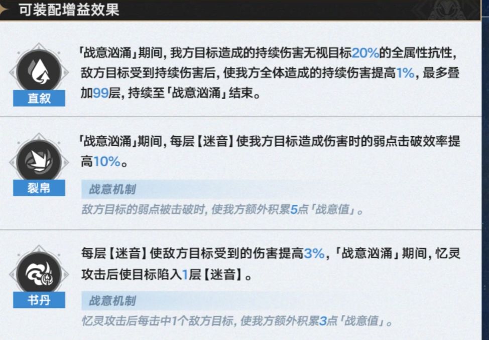 再看虚构三buff兄弟,也就比较简单明了,分别是给dot、击破和记忆三大战舰吃肉的,