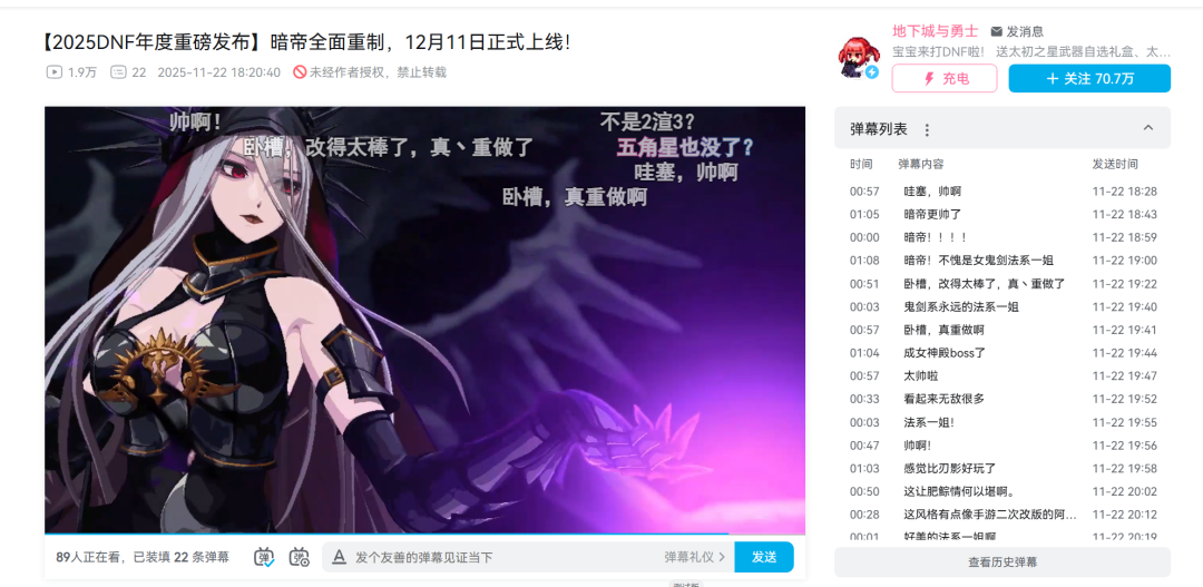 这其中最能调动玩家情绪的,还是职业暗帝(暗殿骑士)的全面重做,从立绘到动画再到技能,而且是国服首发重做——相关视频弹幕和评论区几乎都是赞叹「DNF再次伟大」;