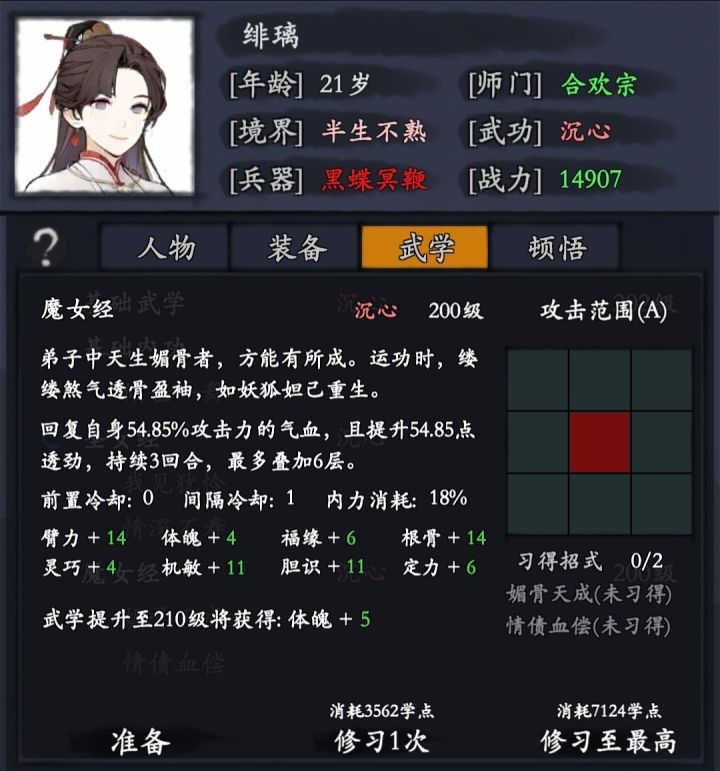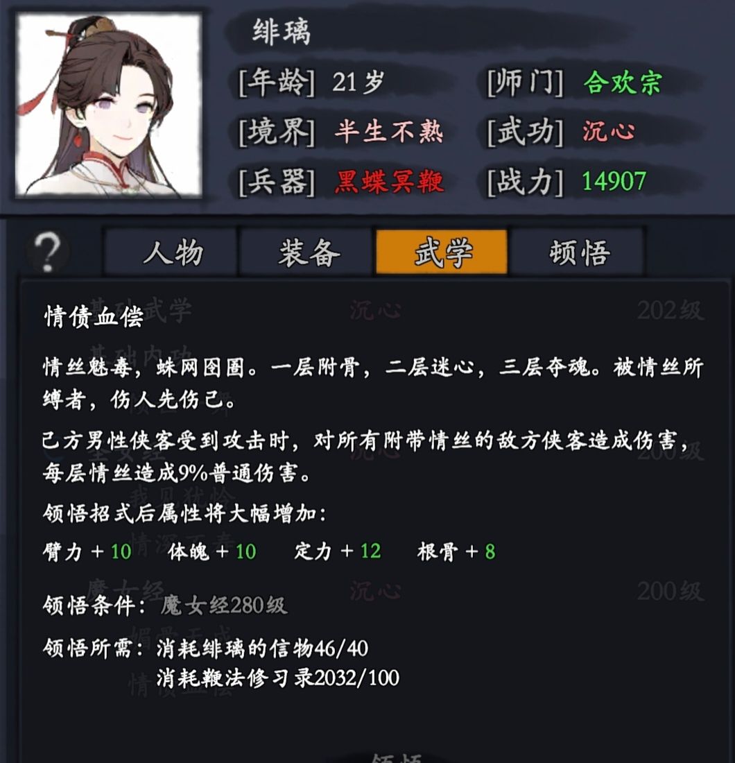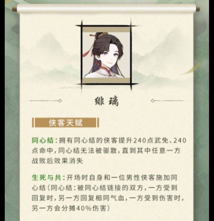 绯璃是个爆伤鞭子 ,靠攻击力数值回血,优先堆攻击、透劲,不要武伤;同心结绑定男侠客后,共同回血和吃伤害,2技能要持续输出,建议堆点肉防止暴毙。(实测还是需要透劲,更快打出伤害)