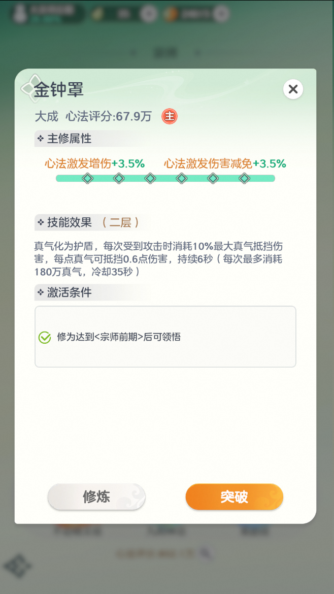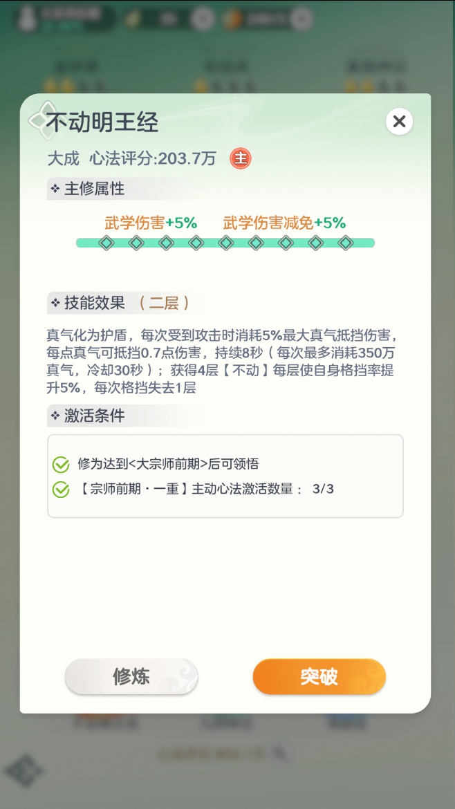 优先使用高阶的主动心法,同样是大成的护盾,二阶的效果比一阶的高1.5%