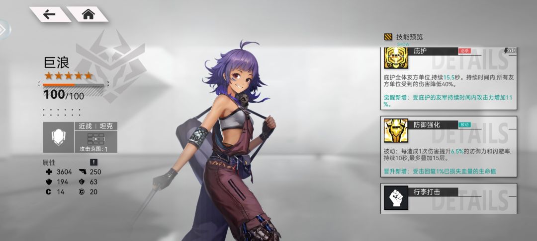 闪避队的T,能过通过普攻给自己叠加闪避率,每次叠6.5%闪避,虽然攻速不快但是配合黑翼舞基本能做到无伤抗压,大招在有15秒40%减伤的同时还有一定的辅助能力,增加全队11%攻击力。