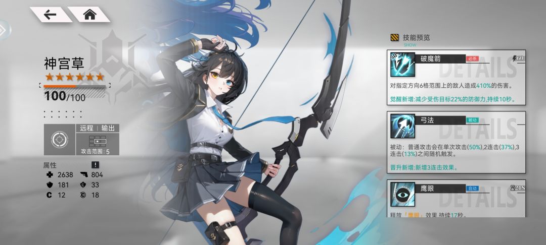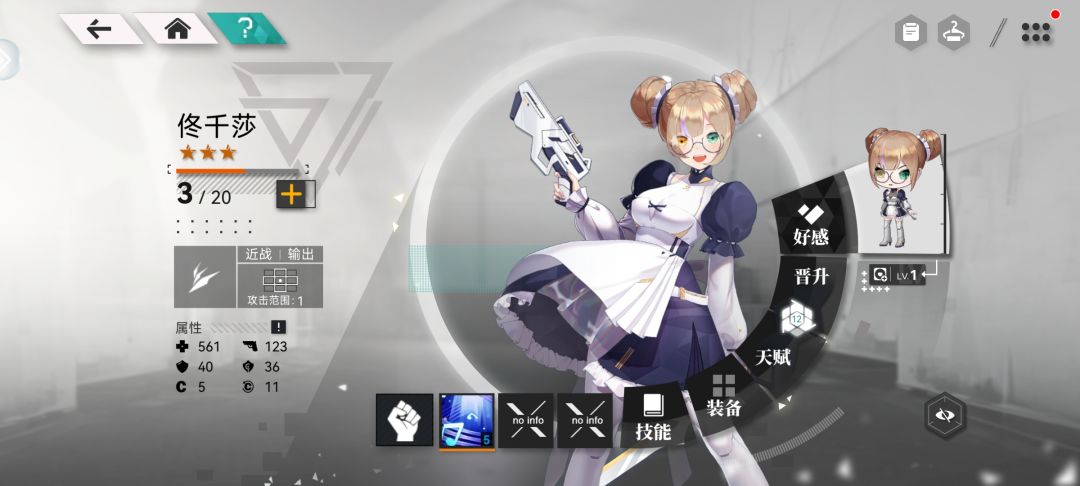 主角团之一,主线免费赠送,非常好用的远程射手,操作好一个人就能通关一些关卡,被动技能50%暴击率还有概率普攻2连击、3连击能让我们在等级比较低的情况下打出很高的伤害,特别是地图上的一些结晶还有召唤装置,需要我们开局有很高的爆发。