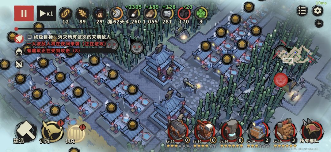 不出意外第二波也是类似的方向,两路敌军会经过同一防御点,这个时候继续在这一路堆防御塔和墙壁。