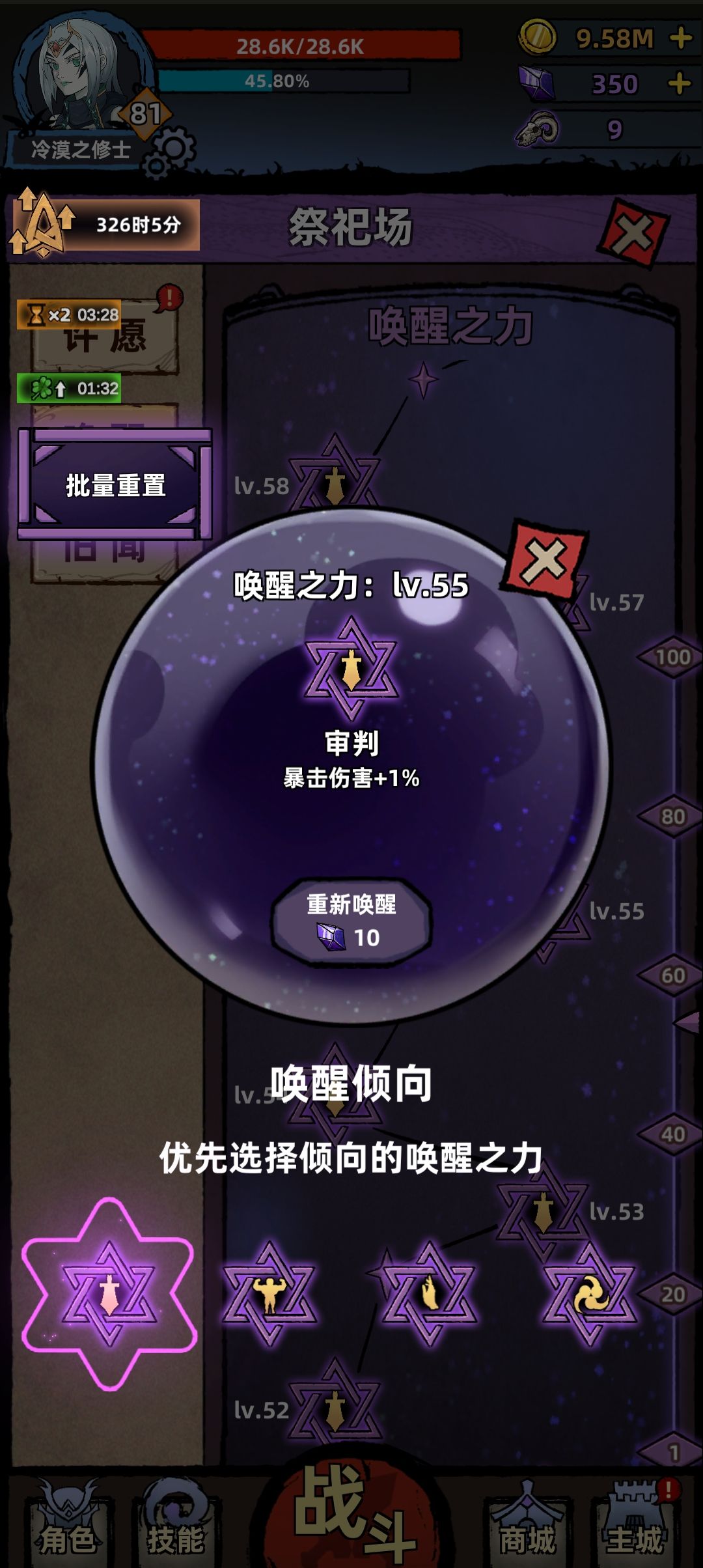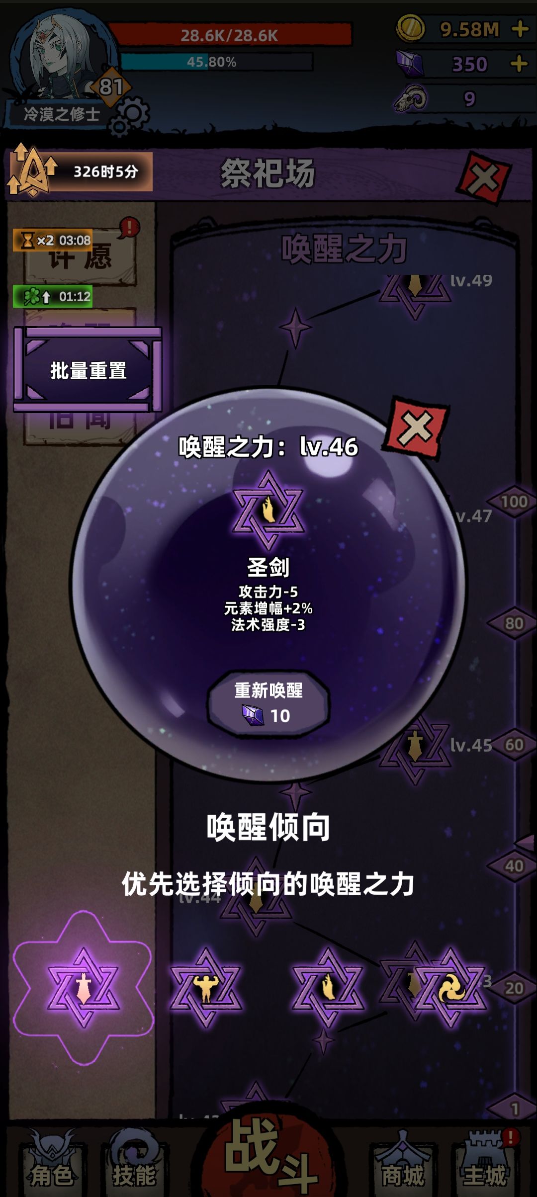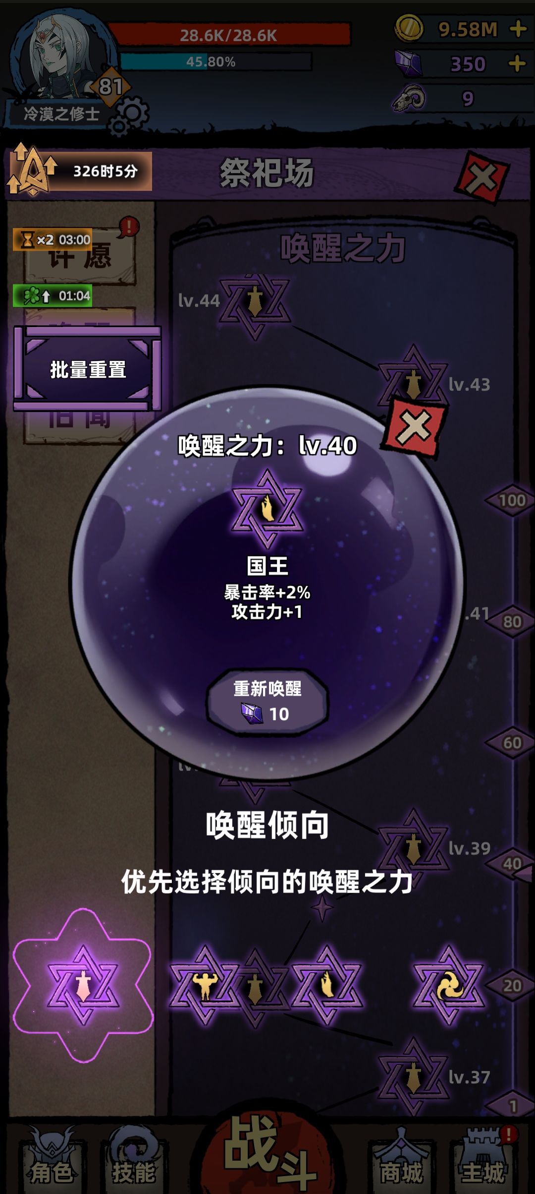 越19级推图,技能先点左链,升级唤醒优先级剑>手>身体>齿轮,洗唤醒洗大剑,圣剑,国王,正义,审判都可以,不要减血词条,装备削抗>保命>其他,魔血翻涌可以开局放或者没打过留着等那个把你打死的回合再放