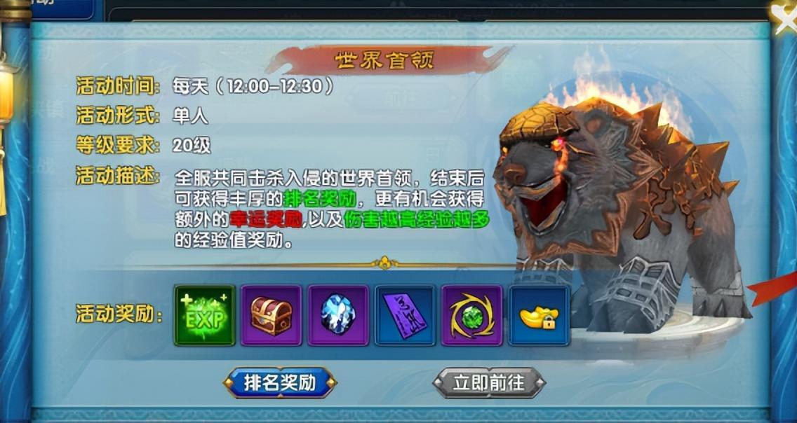 此外,节日庆典、周末狂欢等限时活动奖励远超日常,每天世界BOSS挑战,不仅能斩获高额经验,更有高价值道具掉落。世界BOSS建议组队前往,坦克拉仇恨、输出集火、治疗续航,分工明确就能轻松拿捏丰厚奖励。