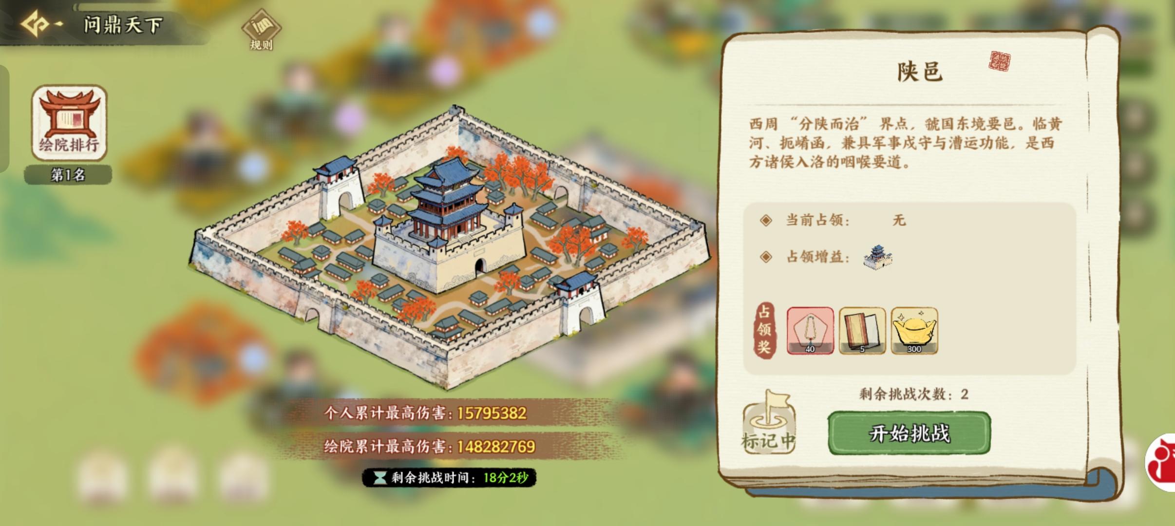 攻城战为每周日晚21:00----21:30分,这个活动需要绘院的人一起努力,事先打哪个一定要商量好,而且伤害不能溢出,要不溢出的伤害都浪费了,最好能商量好谁打哪个,这样更合适,打城最后几分钟可以更好的根据伤害来夺得城市,所以打城最后的几分钟也很重要
