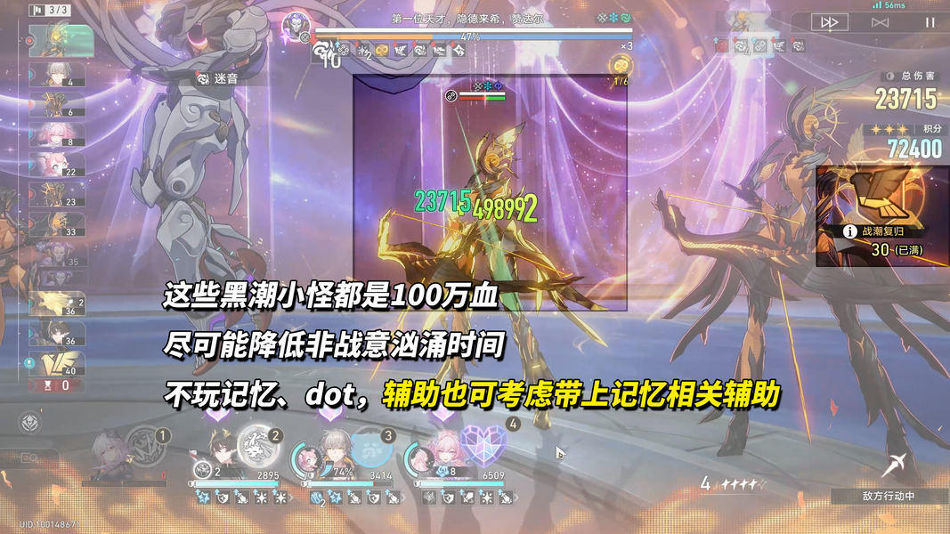 有条件优先考虑高频召唤/引爆忆灵的体系,让来古士加速切换形态叠易伤。其次是对群强劲加速清理小怪的队伍,不过小怪血量100万,对配置/练度稍有需求,且最好能够尽可能多维持在战意汹涌的易伤状态。