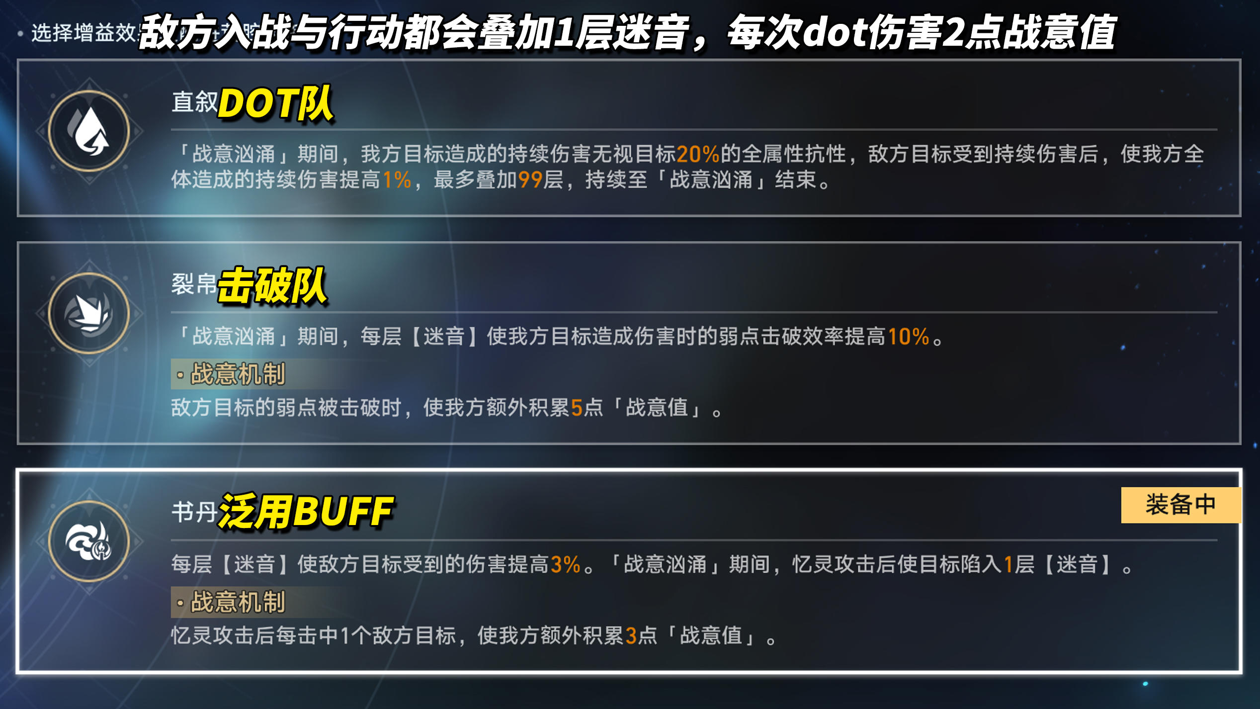 很显然本期极度利好DOT队,至于非DOT队,则需依靠队伍增益,如BUFF2弱点击破给5点战意值、BUFF3忆灵命中给3战意值。