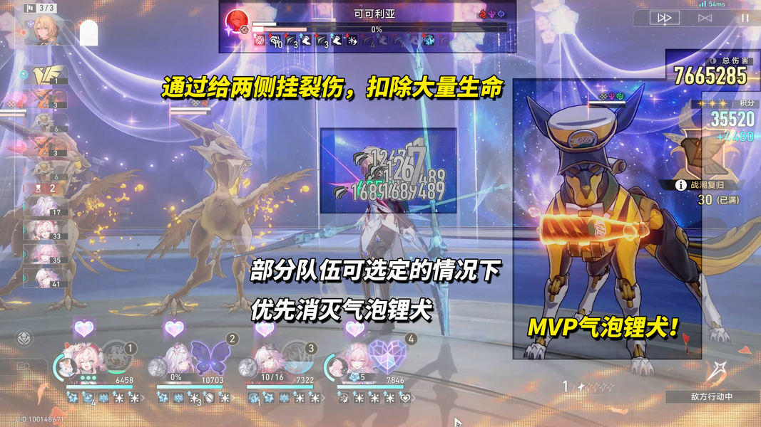 第3波核心在于多打场地内的气泡锂犬,受致命攻击时会自爆,给相邻敌人挂上裂伤DOT并提高对方速度。当可可利亚身上叠加较多裂伤层数时,每次行动都会扣除数百万生命,比绝大多数玩家主动输出要高得多。