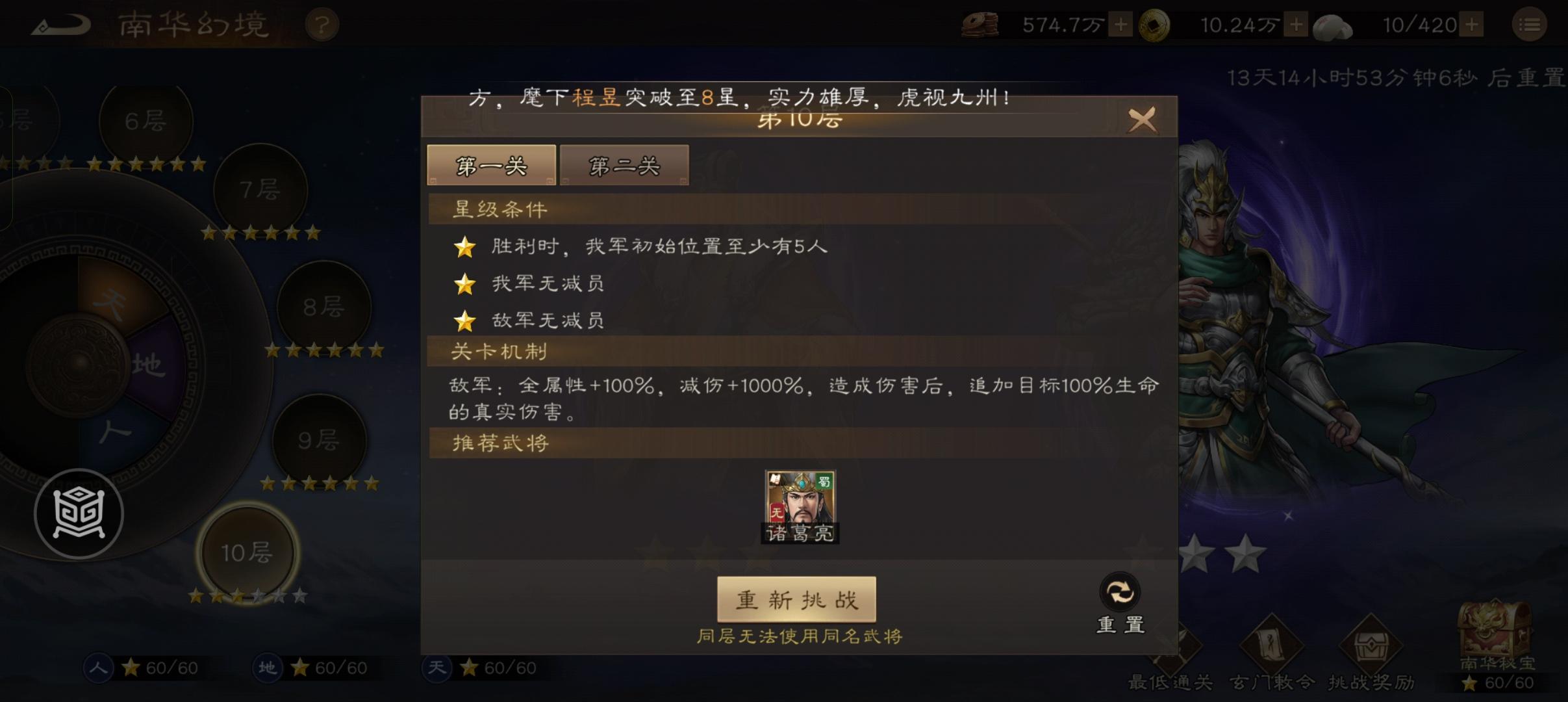 本期的南华幻境难度比之前大了不少...前面有很多关需要你有高数值的武将才能完美过。而第十关则是机制关卡,尤其是10-1,不需要你有多高的培养强度,只要用对应的武将就好!