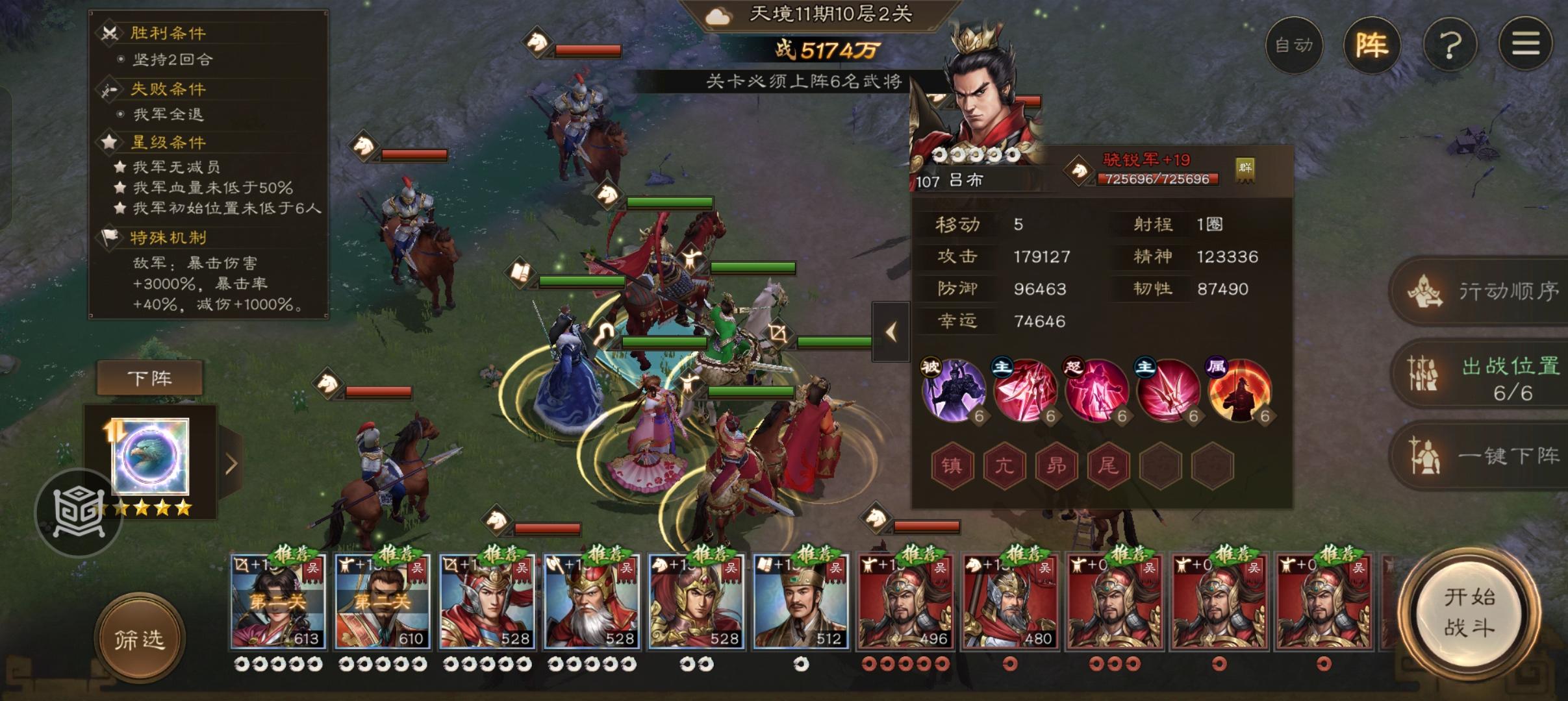 人物配置方面,吴国队很多人天生带有很高的暴击抗性,自然是出战的首选!推荐人物为孙权(有五星神兵最好!)小乔(三星以上神兵最好)刘备(加幸运buff可以帮忙降低敌人的暴击率!重要!!!)其他尽量上高练度的吴国队(孙尚香周瑜太史慈等人自带高爆抗)如果实在没有也可以上你练度最高的主力!因为他们自身幸运很高就不容易被暴击!如果刘备小乔装备差,就扒主力的装备和星符给他们!星符也有带暴击抗性的可以用一下!总之尽量堆高暴击抗性和幸运是本关唯一的过关法宝!