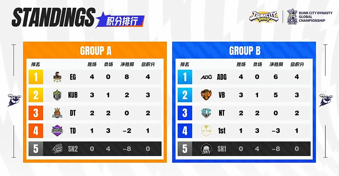 B组ADG大局全胜夺得第一,VB稳居第二进入胜者组,NT、1st分别为小组第三、第四进入败者组,SN1位列最后一名惨遭淘汰。