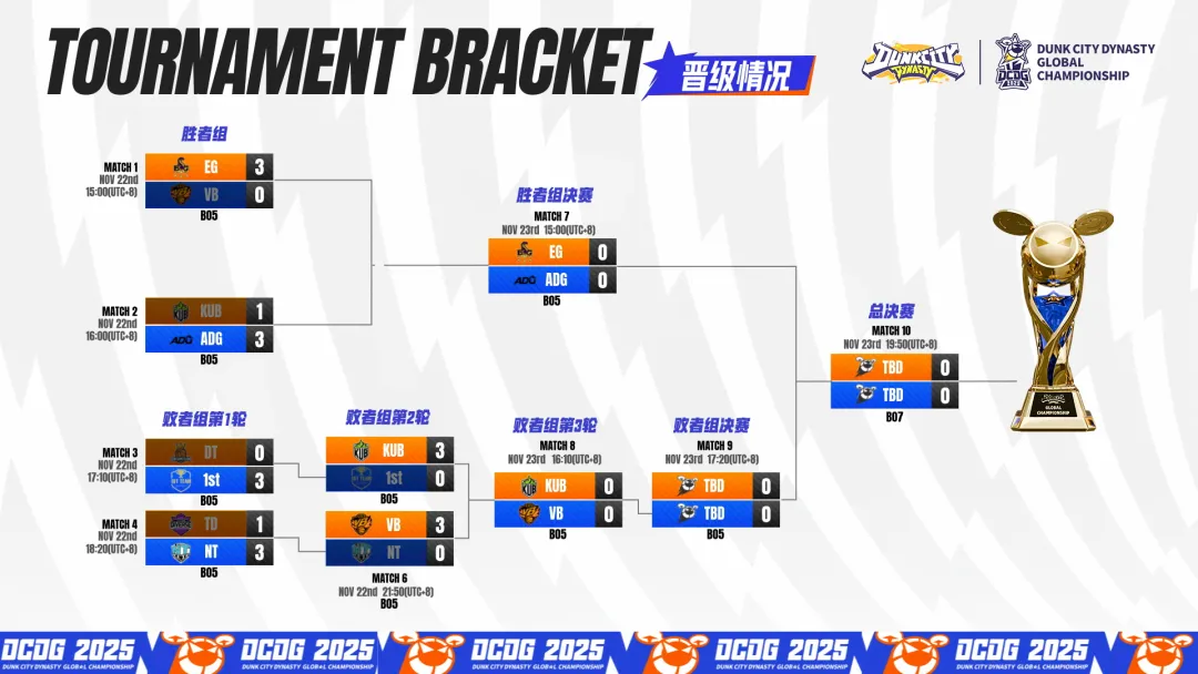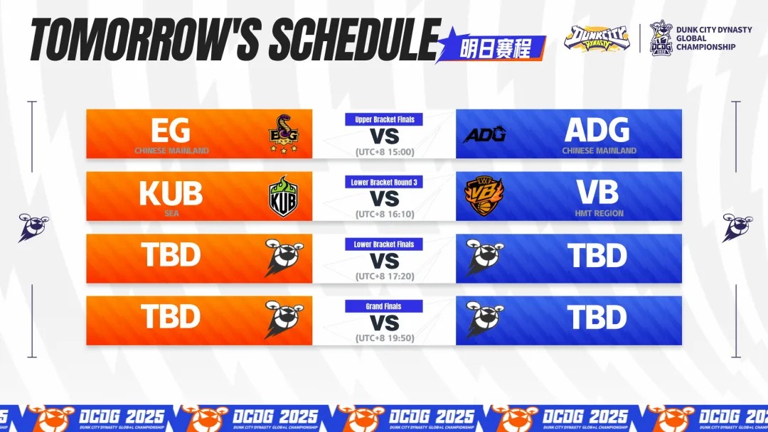 明日决赛由EG率先迎战ADG,败者组则是KUB对战VB。究竟哪两支战队能在总决赛舞台会面?让我们拭目以待吧!