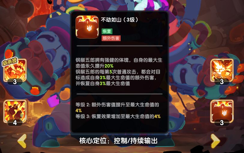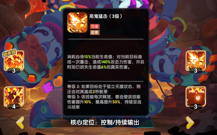 ,血量越低伤害越高、血量越低回血越强;每次作战是你都会看见一个残血的他屹立不倒,但千万别被他的血条给骗了,因为