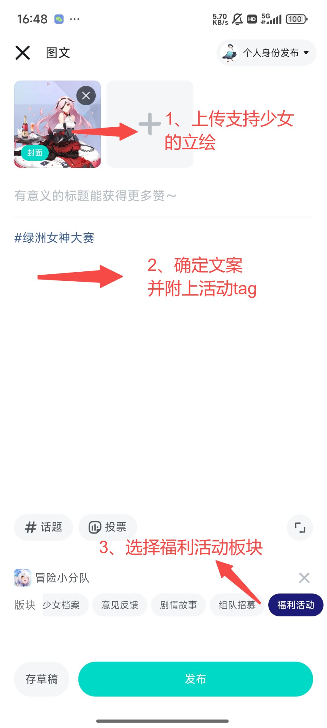 第二步:按照要求上传投稿文案和图片,并附带活动话题: #绿洲女神大赛