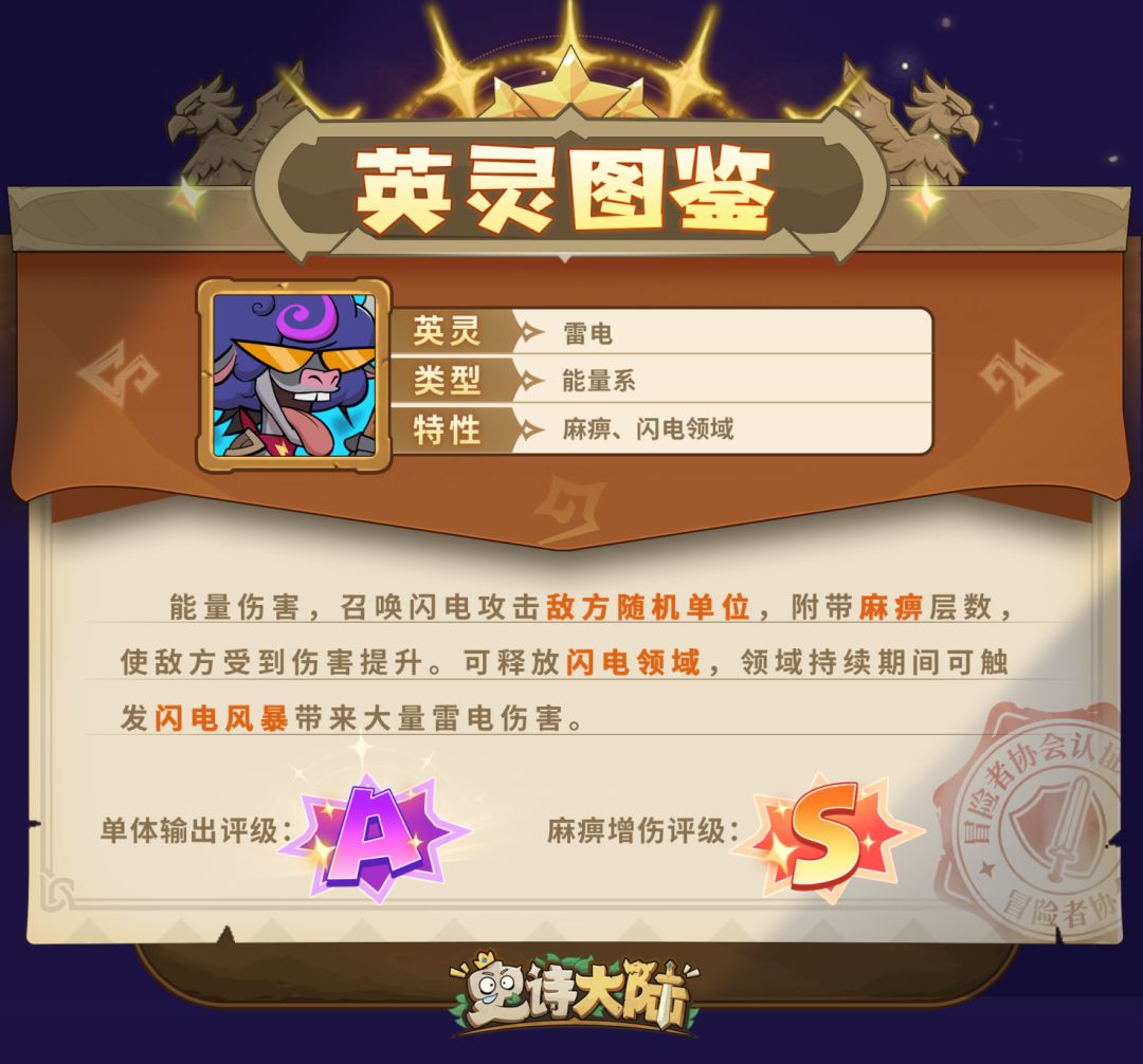 雷电英灵也是一名对群对单都强力的能量系英灵(不是元素系哦~),可以通过触发落雷、闪电风暴、麻痹增伤等方式越战输出越高。