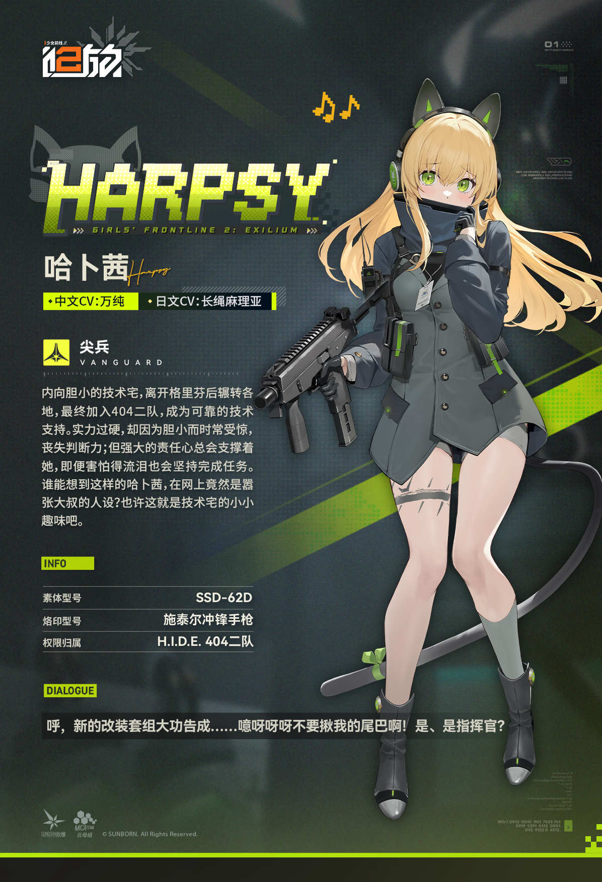 内向胆小的技术宅,离开格里芬后辗转各地,最终加入404二队,成为可靠的技术支持。实力过硬,却因为胆小而时常受惊,丧失判断力;但强大的责任心总会支撑着她,即便害怕得流泪也会坚持完成任务。谁能想到这样的哈卜茜,在网上竟然是嚣张大叔的人设?也许这就是技术宅的小小趣味吧。