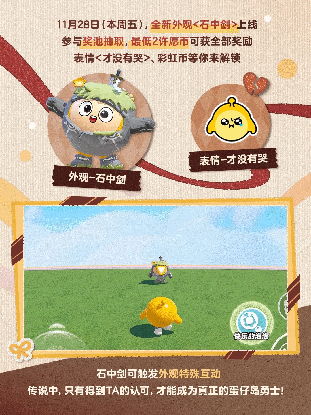 🍂全新外观上线:11月28日(周五)全新外观<石中剑>登场!外观特殊互动解锁,速来测试你是否为TA认定的天选之蛋~