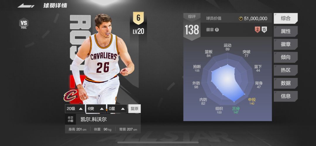 科沃尔拥有201cm的身高,和207cm的臂展,这样的模型让他在投射中拥有较高的出手点,同时能够补充一些他在防守端数值上的不足。