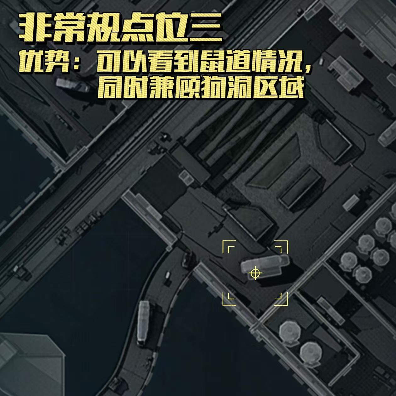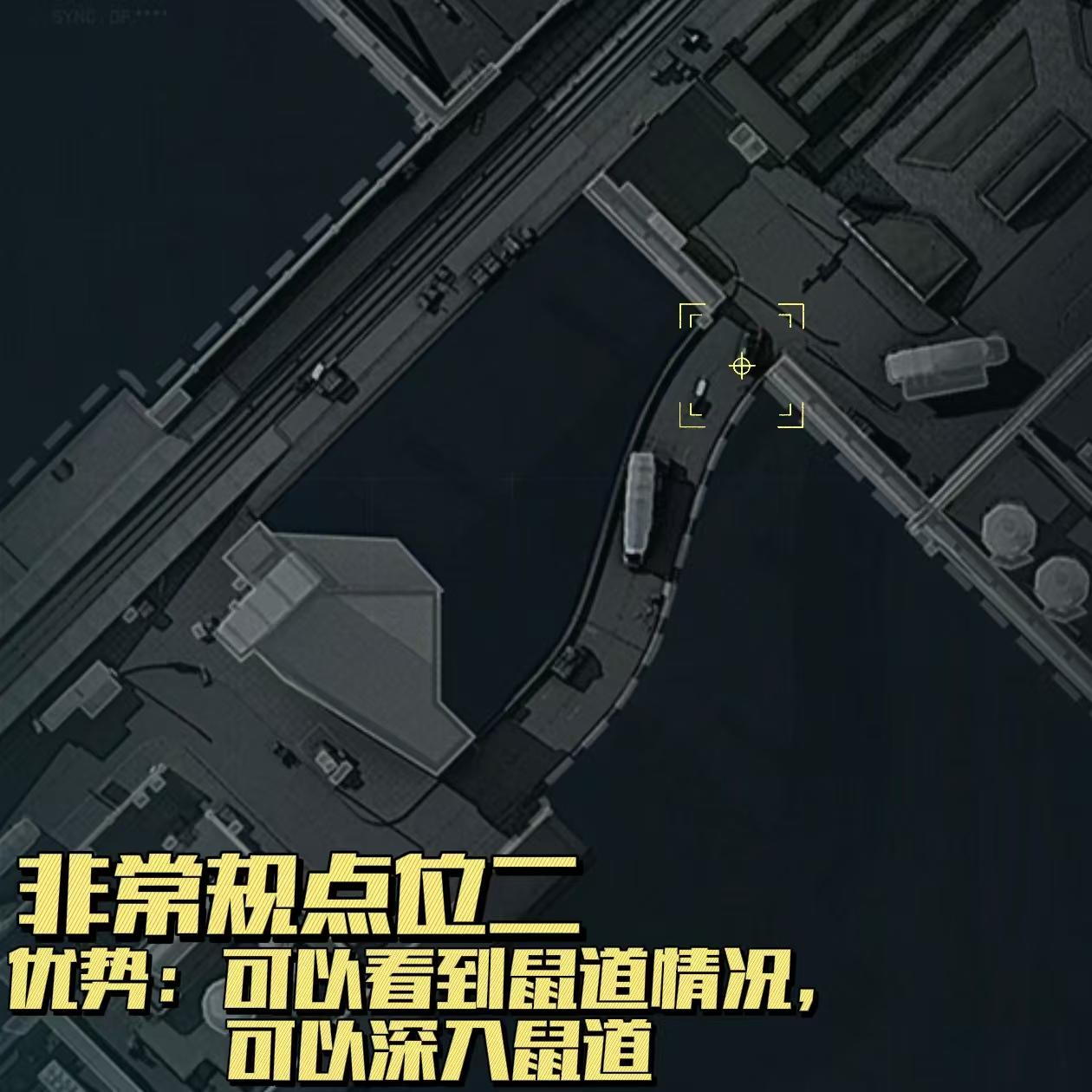 第二个非常规点位只需要我们在第一个点位的基础上向前移动一段距离,找到一辆黄色小轿车作为掩体即可。这个位置非常适合观察鼠道中敌人的情况,可以安排一个队友在这个位置,有效应对敌人冲鼠道威胁到桥上安全的情况,如果银翼在这边也能灵活选择进入鼠道集装箱来消耗离心和黑室的敌人。
