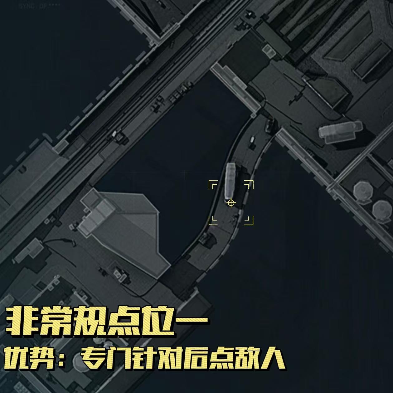 好的正片开始,第一个非常规点位就是专门针对后点敌人的点位,毕竟谁都不想被偷到背身功亏一篑的嘛——我们来到小桥上,找到图中标记的位置,跳到货车上可以比较安全地去观察后点的敌人,不过视野有限,最好是有敌人的信息或者抓住对方破绽时开枪。