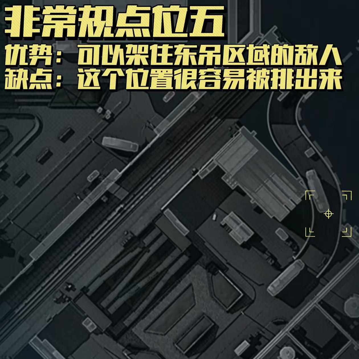 第四个非常规点位我们来到桥下电梯的位置,找到图中标记的靠墙堆积的铁箱,侧身观察可以获取到卷帘门区域敌人的信息,甚至能有效地威胁到从黑室上绳索的敌人,不过这个点位比较危险,可以灵活选择去飞升任务箱子后面去消耗敌人。