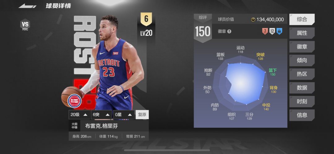拉满后,格里芬的投篮数值十分不错,140的129的三分,搭配银色定点射手徽章,接球投篮后的命中率还是相当可观的。但是需要注意的是,格里芬没什么热区,同时投篮包会有一点卡顿的感觉,最好还是不要当做常规武器来使用,老老实实做个底角蹲子还是不错的。