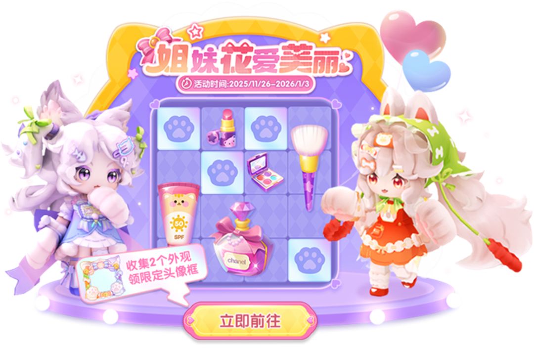 通过完成任务获取“爪爪"道具,消耗“爪爪“可以点亮互动区域寻找“化妆品"。每点亮爪爪区域可以获得免费的奖励,找到1个“化妆品“还可获得姐妹花的抵扣券!集齐两款皮肤还能解锁限定奖励!