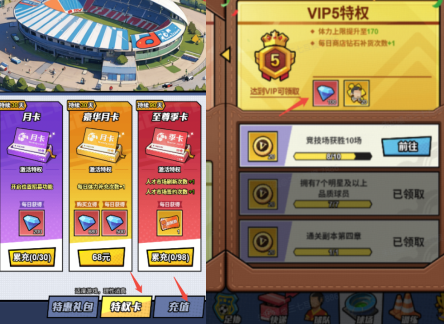 e. 充值:购买月卡、季卡,或者直接充值钻石。解锁vip特权。(可立即获得大量钻石)