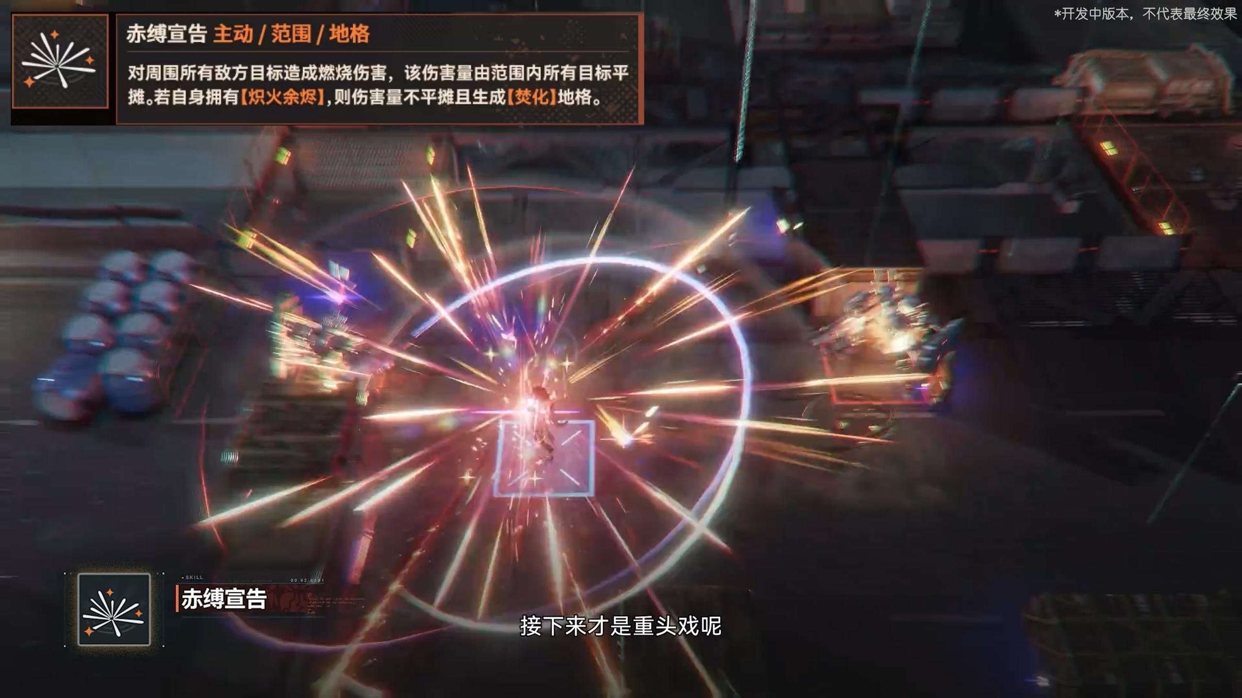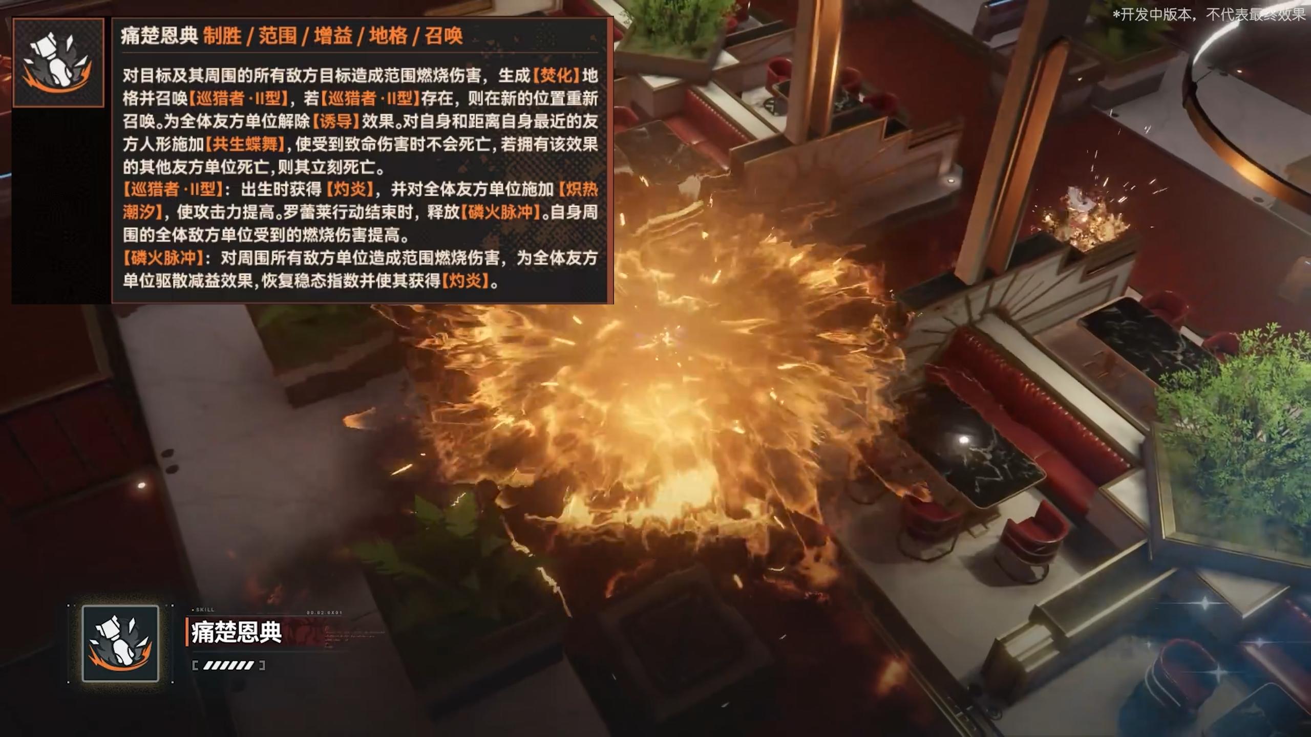 剩下的技能就简单了,二技能单体伤害,三技能aoe伤害。拥有【炽火余烬】时,二技能伤害系数翻倍,三技能aoe伤害量不会被分摊,这两个效果在实战的时候是常驻的。