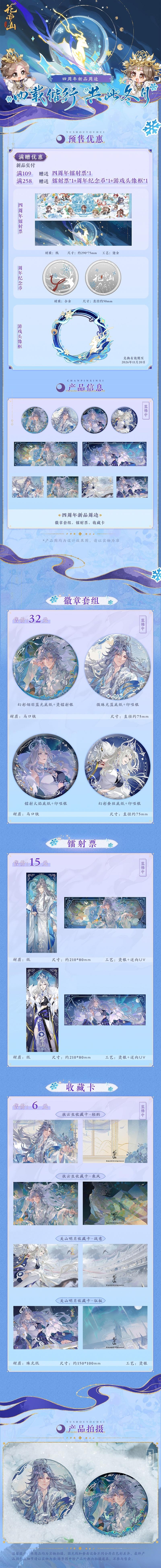 ②新品预售期实付满109元赠四周年镭射票1张,单笔订单满258元赠送四周年冰雪镭射票1张+四周年纪念币1个+游戏内头像框-沧溟踏雪1个