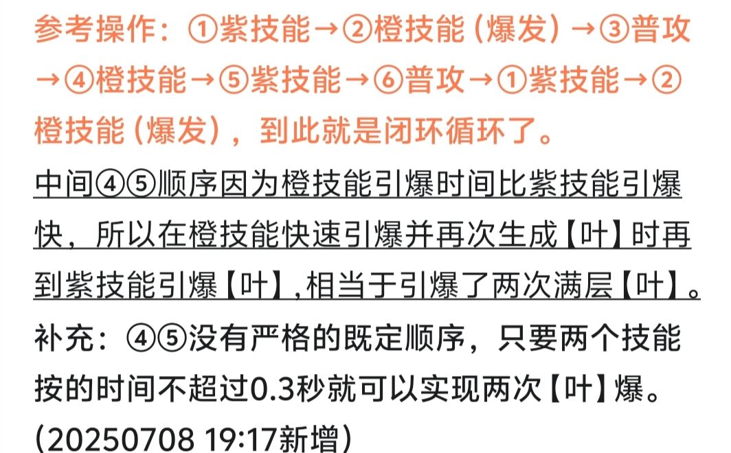 目前经过我的一些纯粹经验试出来的结果来说,手点橙,其他技能全连点是比较好的方式,首先不容易跳紫,其次对于第二波小怪来说可以更好的控制紫橙的时间减少凹度。而相对于手动橙比较慢丢伤可以完全不用怕,因为按照此方法的低练压线通关一半的伤害都集中在两波小怪的双炸