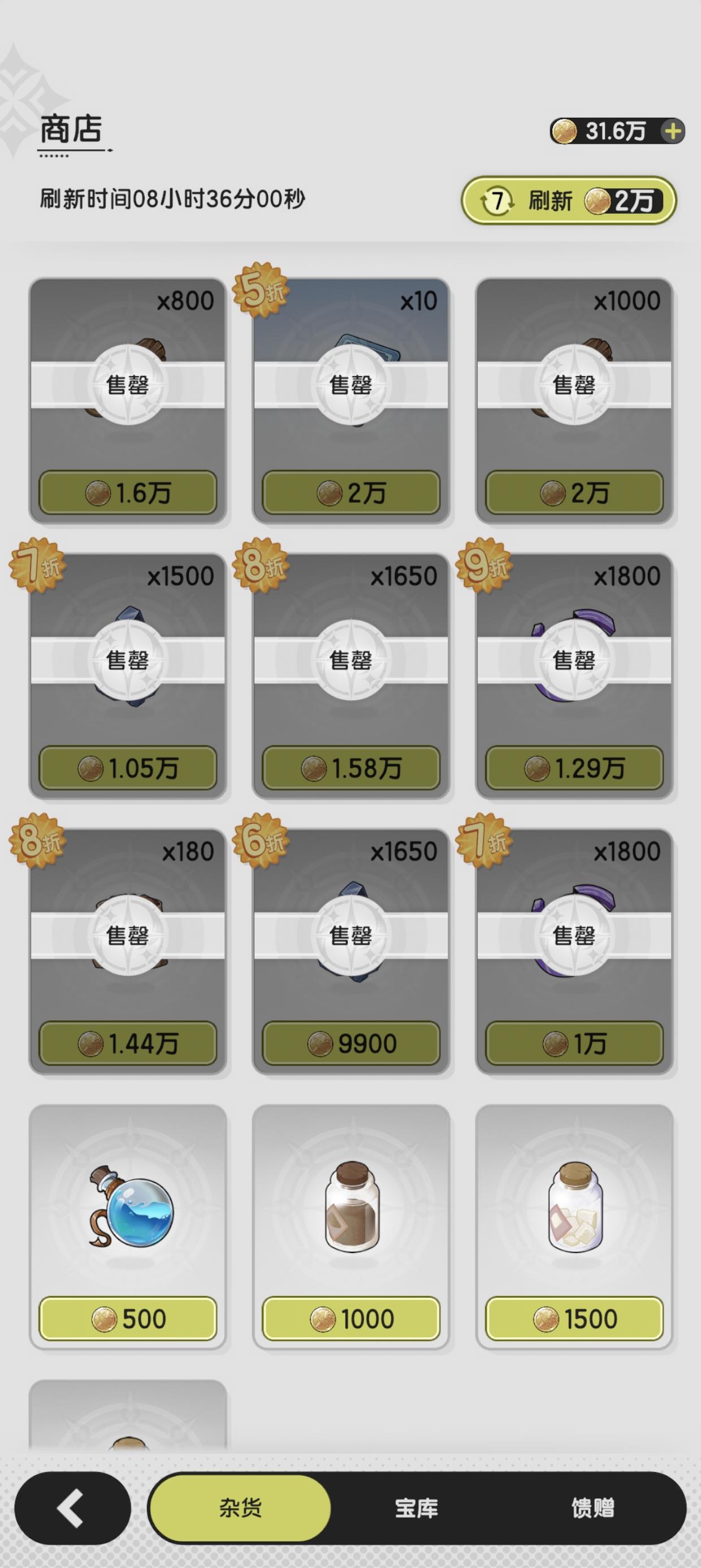 金币商店每天刷新到至少两万金币,除了下面固定的几个物品,其他的全部清空。记住是每天。