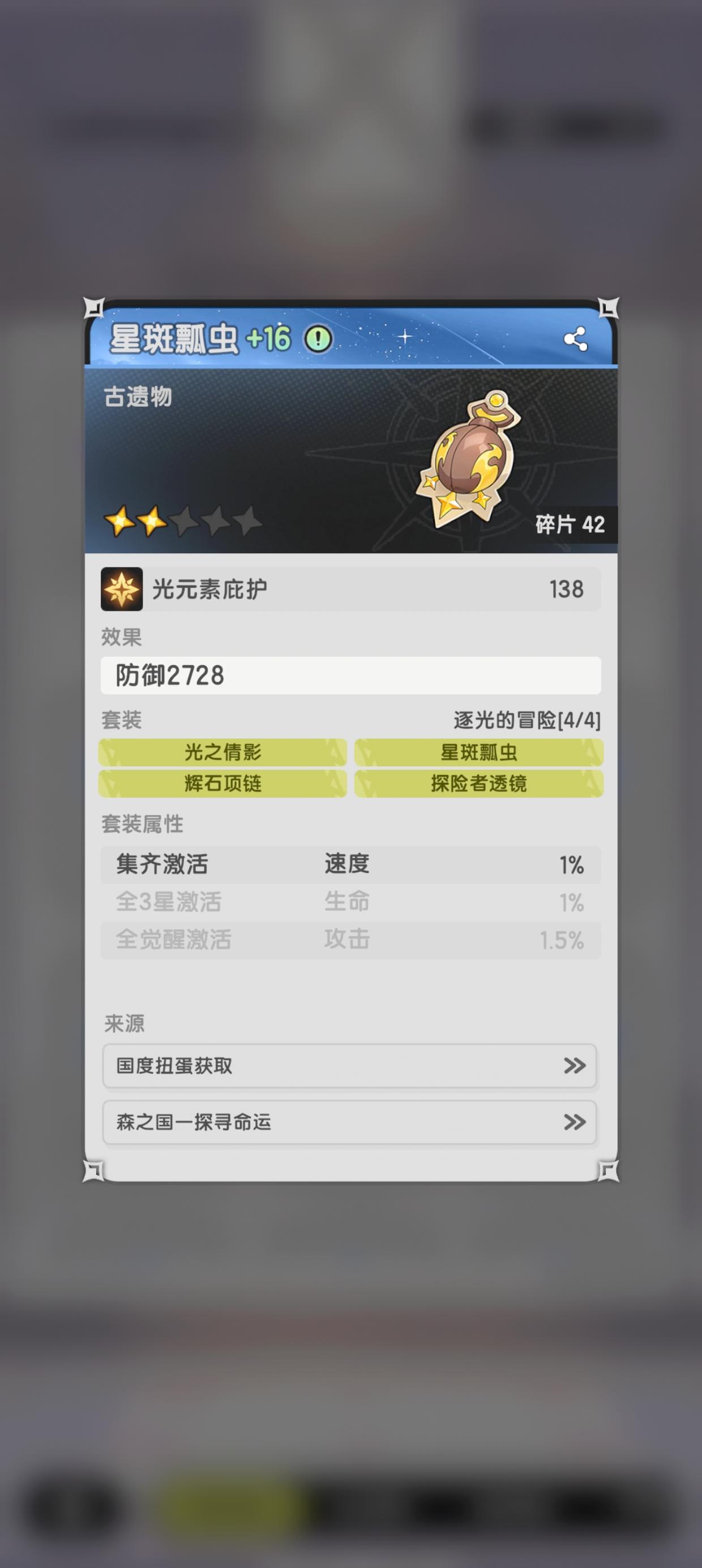 抽到重复遗物可以升星,当套装的遗物都达到一定的星数要求后可获得额外的套装属性,不同套装的额外的套装属性不同,稀有遗物5星后消耗60自身碎片+60其他稀有溢出碎片可升至觉醒星级,史诗遗物5星后消耗90自身碎片+90其他稀有溢出碎片可升至觉醒星级。部分遗物可在指定的小区域消耗命运果实探寻,遗物对应的区域可在遗物套装图鉴,点未获得遗物查看来源来确定。部分遗物需在国度遗物池和元素遗物池获取,元素遗物池的抽取道具较难获取,建议抽取职业主要打伤害的元素或自己需求属性多的元素,贤者推荐暗,斗士推荐暗火风,术士推荐光火风,骑士推荐水光。