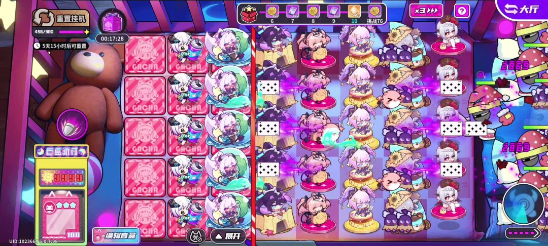 那萌新打不过能怎么办呢?有个小诀窍:放置作战的右上角有个问号,点击问号进入帮助界面可以重置角色的冷却时间,阵容放上电玩少女,然后不断点击问号,制造小人大军,能大幅降低游戏难度。具体看下面这段视频。