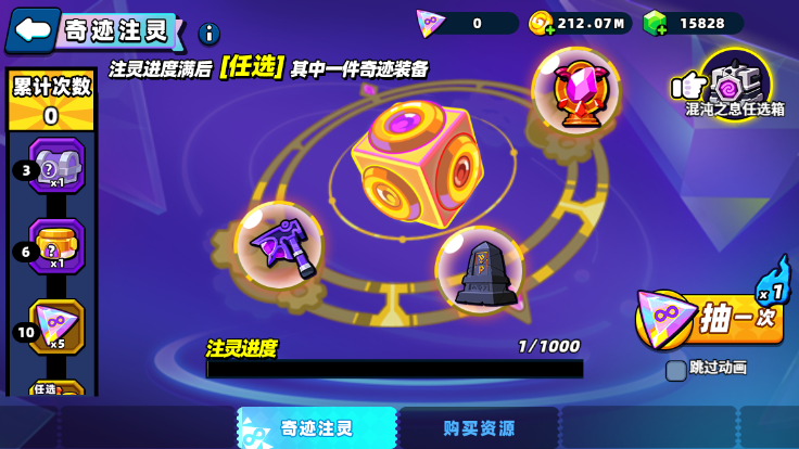 (2)「奇迹注灵」:RMB充值获取,奖励为【奇迹装备3选1】。每次活动指定「圣光之瞳任选箱」、「命运之轨任选箱」、「混沌之息任选箱」、「湮灭之渊任选箱」、「亡者之骸任选箱」其中一个,下期进行更换。