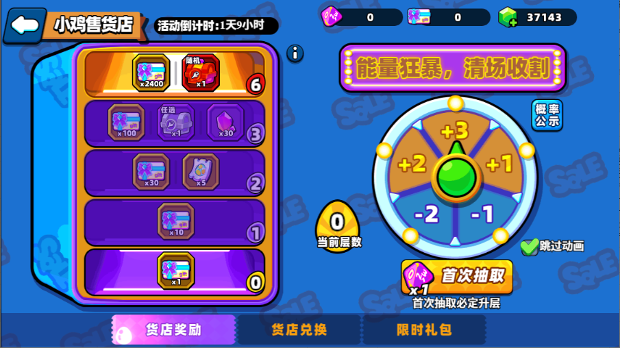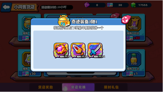 (1)「小鸡售货店」:钻石获取,30w钻石必得,奖励为【奇迹装备3随1】。每次活动指定「超奥狂斩魂」,其中一个流派的奇迹装备作为奖励,下期进行更换。