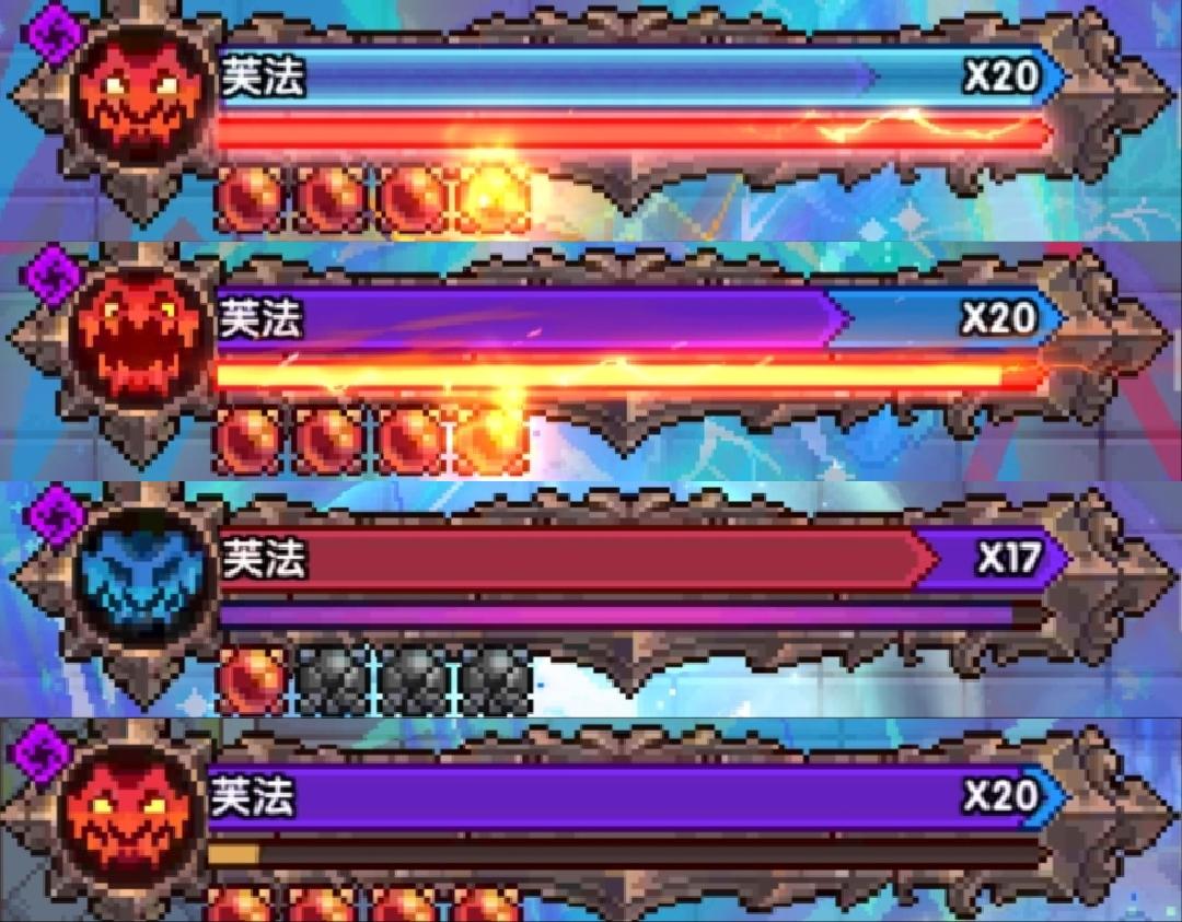 如图,从上到下为护盾,狂暴,破防,普通状态。