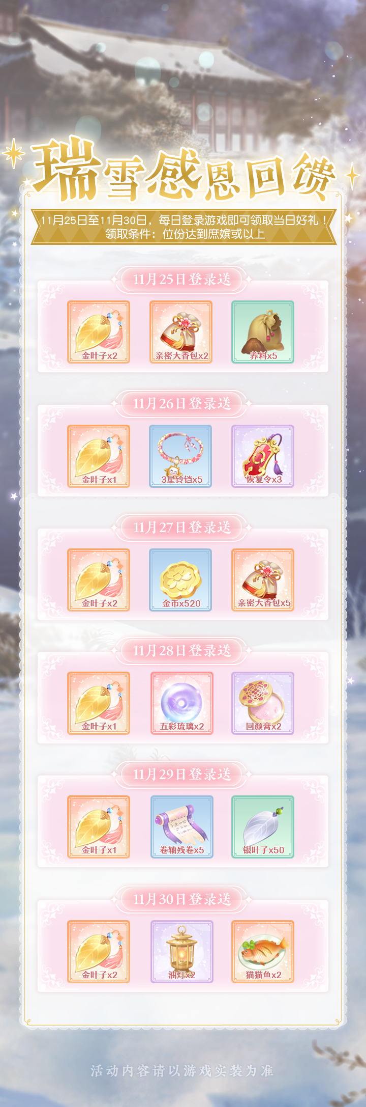 ❤ 在11月25日至11月30日期间,小主每日进入宫廷即可领取一份当日的奖励。(领取条件:位份达到庶嫔或以上)