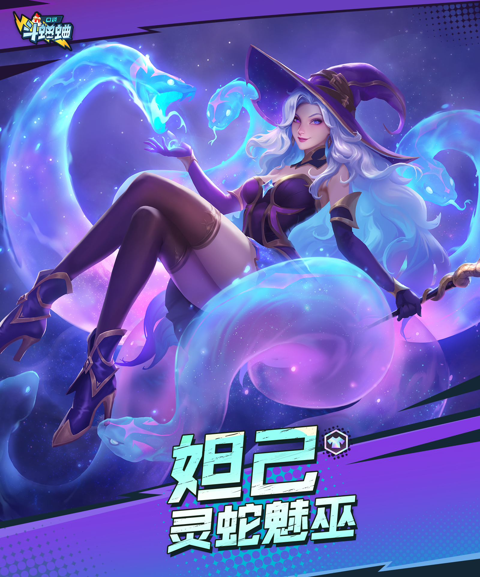 们从星之女巫会的设定中汲取灵感,将妲己标志性的妖媚气质,升华为一种背负沉重命运的“神性魅惑”。服饰色彩以星穹的幽紫与银白为主基调,象征她所代表的“灵蛇”之力。