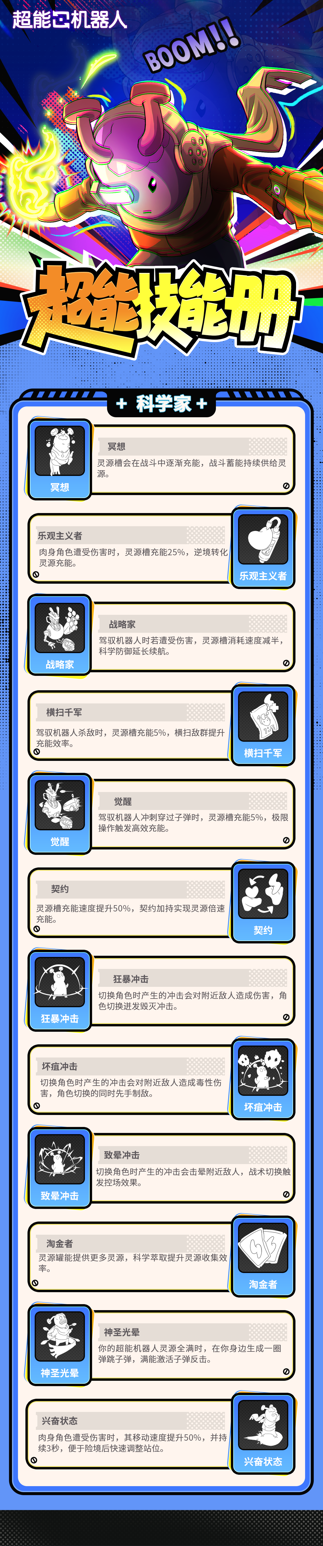 本次「超能技能册」,深挖「科学家」成长线的核心加点逻辑 —— 从灵源快充提速到消耗节流,从逆境补能到满能爆发,全面适配超能机器人驾驭、肉身周旋、战术切换等多元战局,帮你精准锚定核心玩法,快速充满灵源召唤超能机器人,与超能机器人一齐制霸战场!
