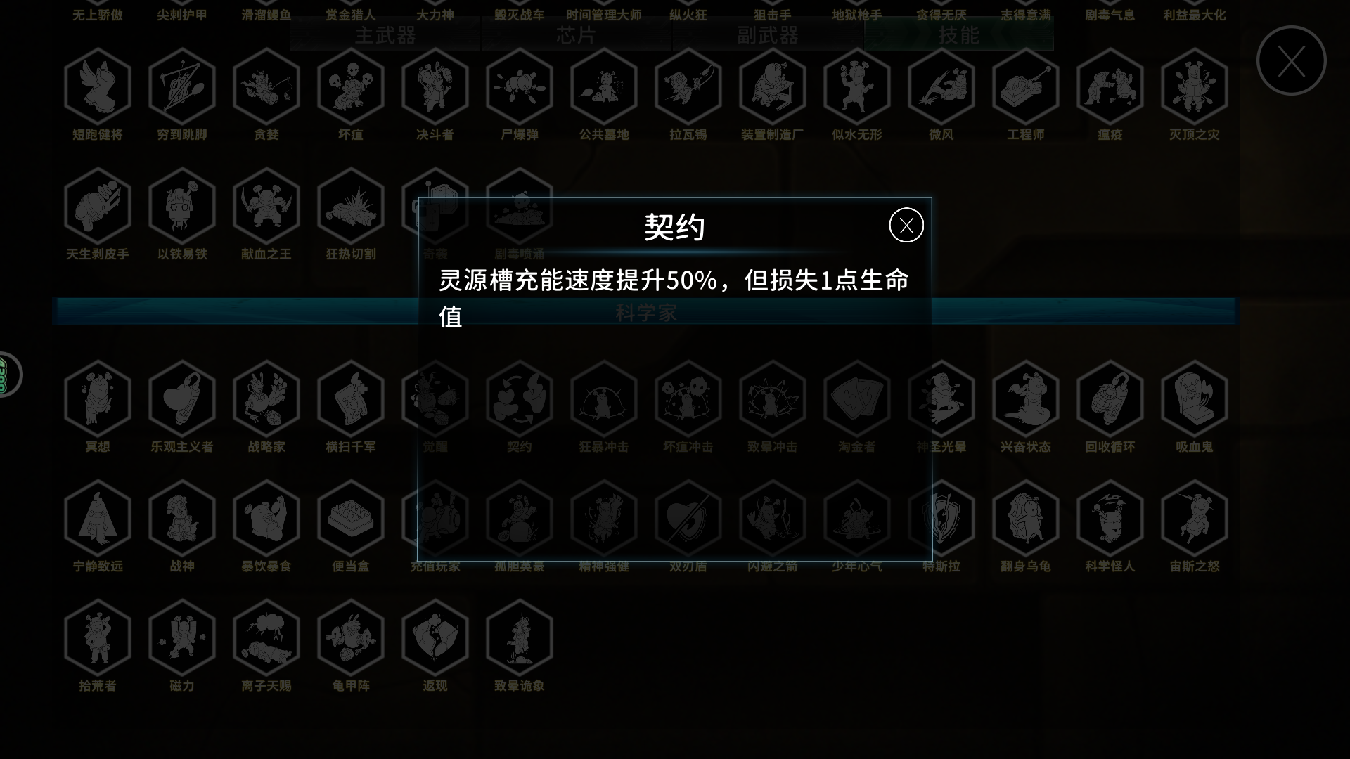 在实战中,合理选择「科学家」的分支,能够提升超能机器人持续时间,同时在一些技能选择上推荐能够提升充能效率的一些技能,如技能【契约】用1点生命值的代价,快速提升灵源充能速度。