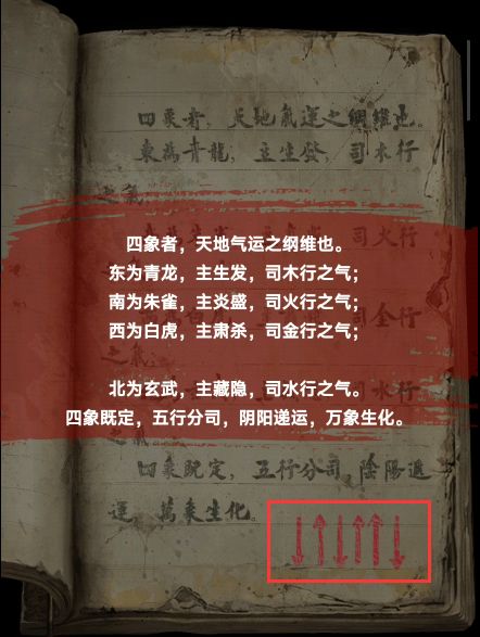 3、使用八卦玉打开藏书阁,左边桌上有书记载离开的方法,右边的书柜上获得【司南】以及一本书,书中记载四象方位及右下角有红笔写的箭头信息,十二月份的地支,根据地支信息和墓室门口右边桌上的第二页画有月亮符号的地支信息,打开藏书阁中间的箱子,获得【解腕尖刀】和【青铜钥匙】。