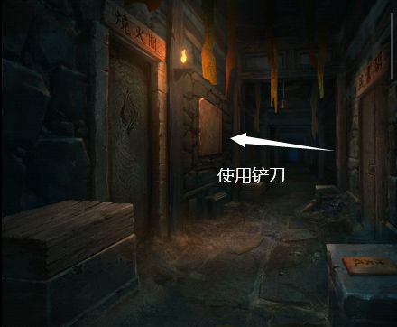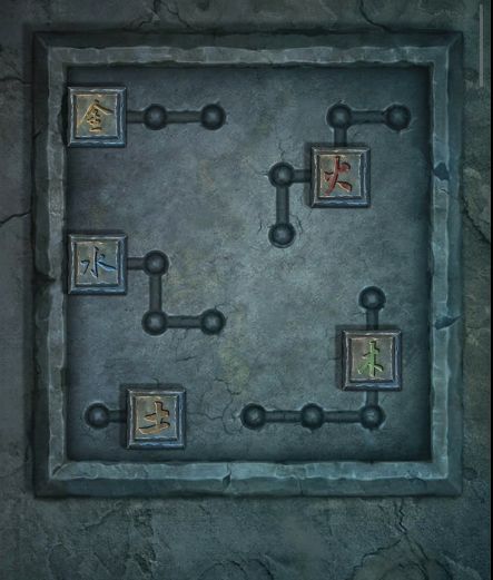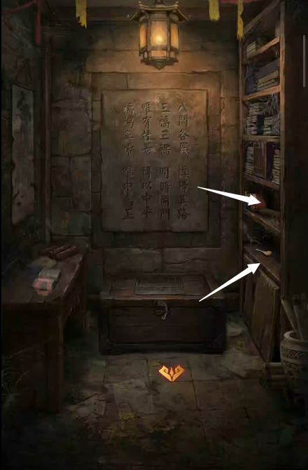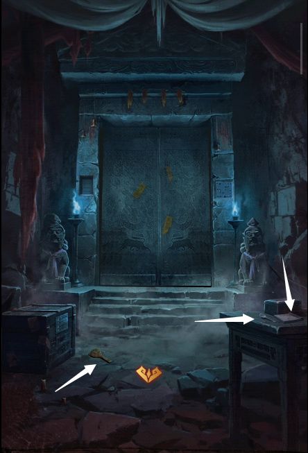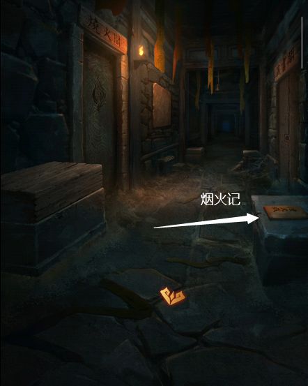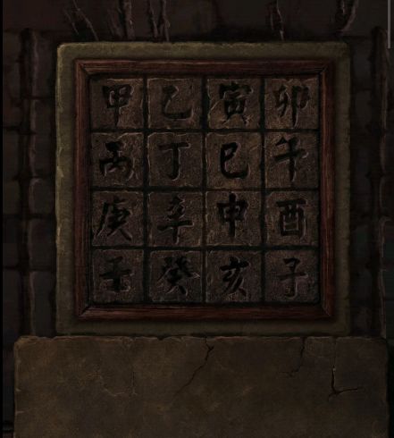 9、根据之前记载的四象方位,把三张玉牌放在烧火阁的桌上,获得【土方块】,根据墓室内墙上记载的图形,将土方块放在墓门右边的墙上,根据书本记载挪动方块在正确的位置,墓门打开,本章结束。